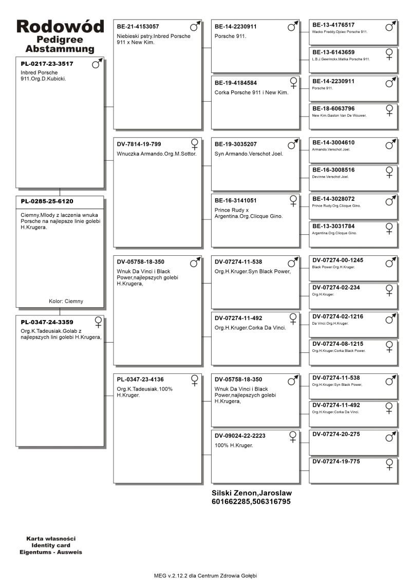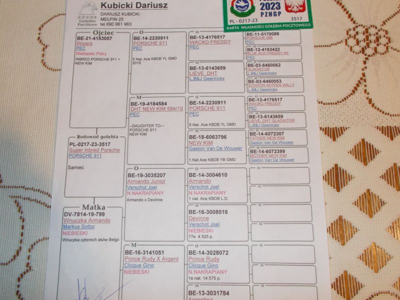 OJCIEC OFEROWANEGO GOLEBIA TO WNUK PORSCHE.MATKA POCHODZI Z GOLEBI H.KRUGERA.
