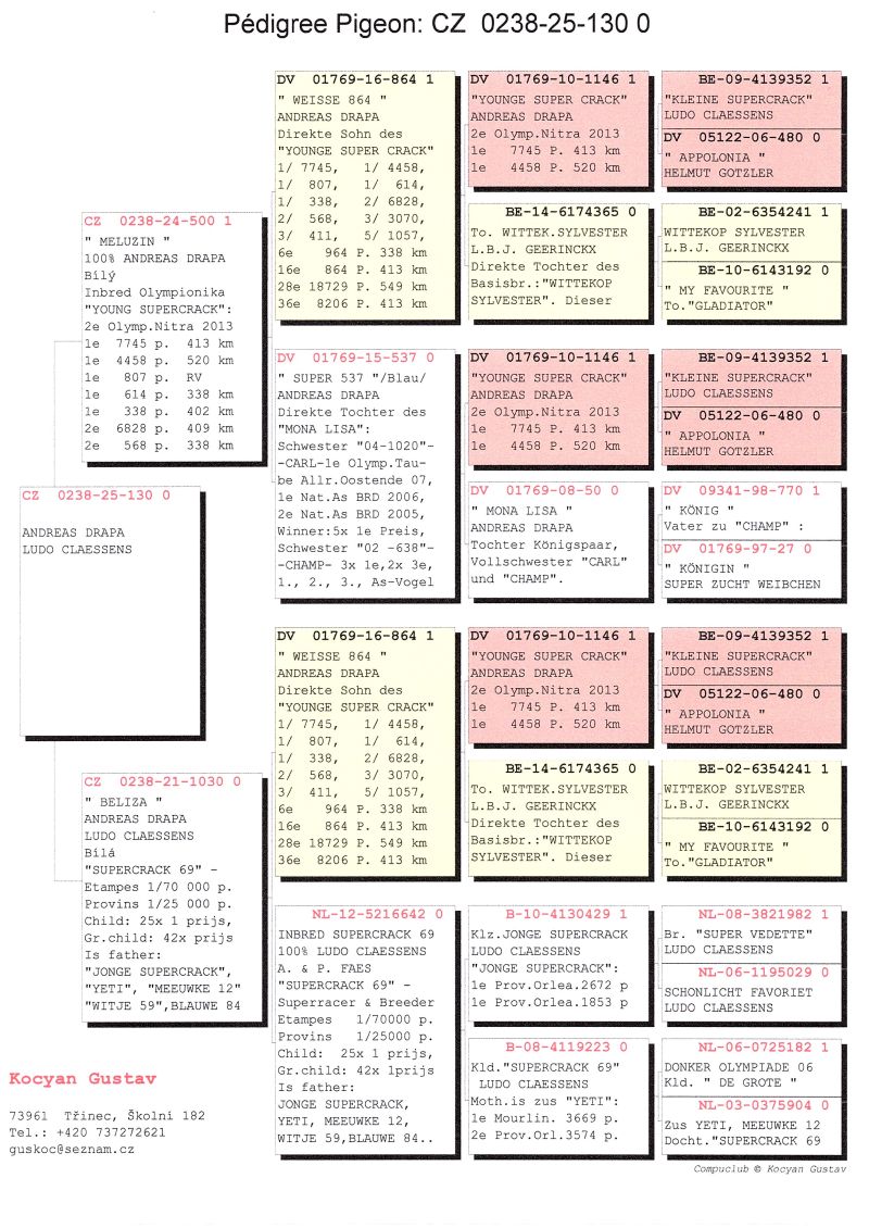 Oryginalny gołąb z hodowli Gustav Kocyan. Szczegóły pochodzenia zawarte w rodowodzie. Wysyłka prywatnym kurierem po wcześniejszej wpłacie na konto w banku Polskim. Koszt wysyłki 150 zł., max. 4 gołębie w paczce. Mile widziany jest także odbiór osobisty. Hodowca mówi po polsku.