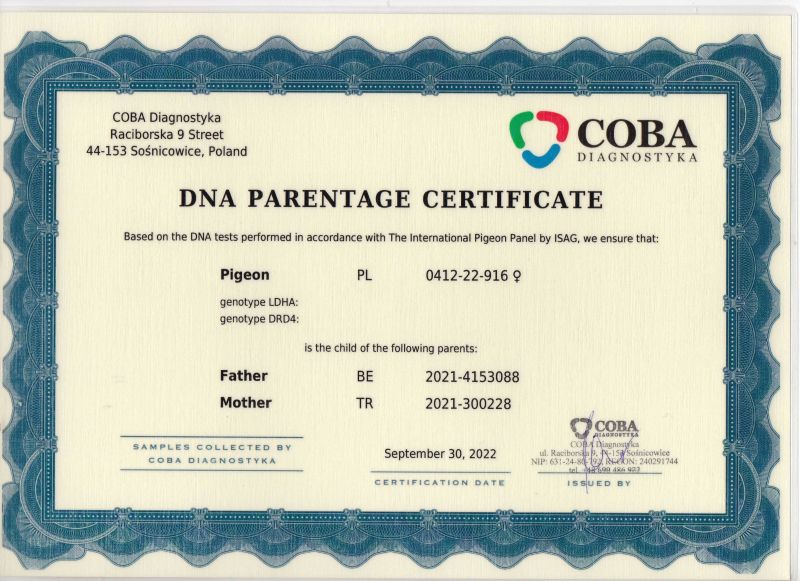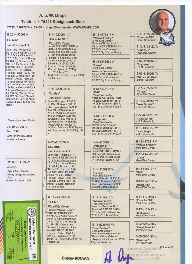 Oryginalny gołąb z hodowli Gustav Kocyan. Szczegóły pochodzenia zawarte w rodowodzie. Wysyłka prywatnym kurierem po wcześniejszej wpłacie na konto w banku Polskim. Koszt wysyłki 150 zł., max. 4 gołębie w paczce. Mile widziany jest także odbiór osobisty. Hodowca mówi po polsku.