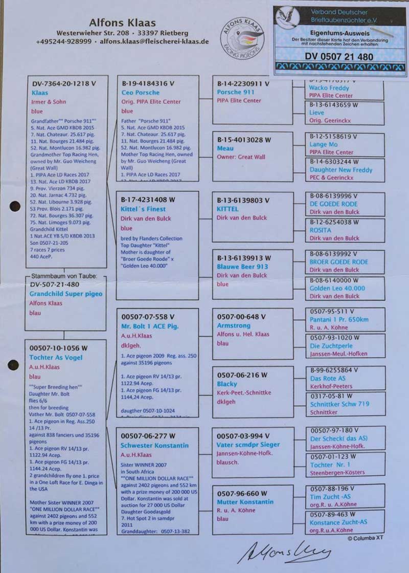 Oryginalny gołąb z hodowli Alfons Klaas. Więcej informacji w rodowodzie oraz pod numerem telefonu: +49 173 3549283 Mój wynik Algarve 2025 Finał: 137, 180, 548, 774, 1856 na 3334 gołębie