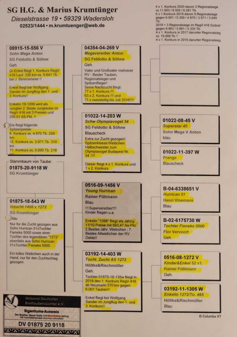 Oryginalny gołąb z hodowli SG H.G. & Marius Krumtunger. Więcej informacji w rodowodzie oraz pod numerem telefonu: +49 173 3549283 Mój wynik Algarve 2025 Finał: 137, 180, 548, 774, 1856 na 3334 gołębie