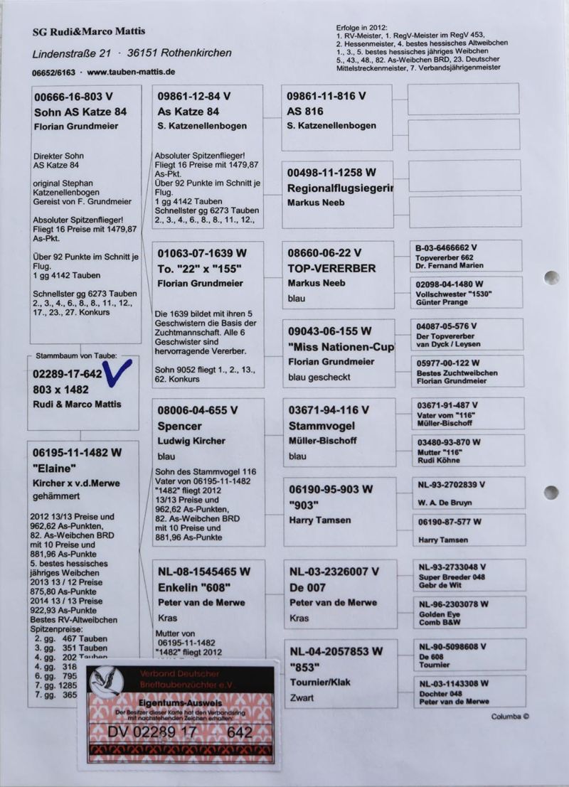 Oryginalny gołąb z hodowli . Więcej informacji w rodowodzie oraz pod numerem telefonu: +49 173 3549283 Mój wynik Algarve 2025 Finał: 137, 180, 548, 774, 1856 na 3334 gołębie