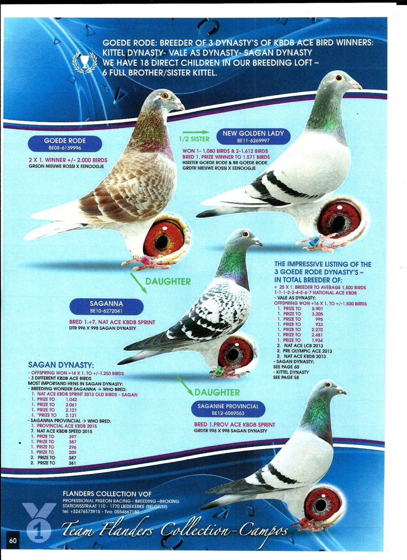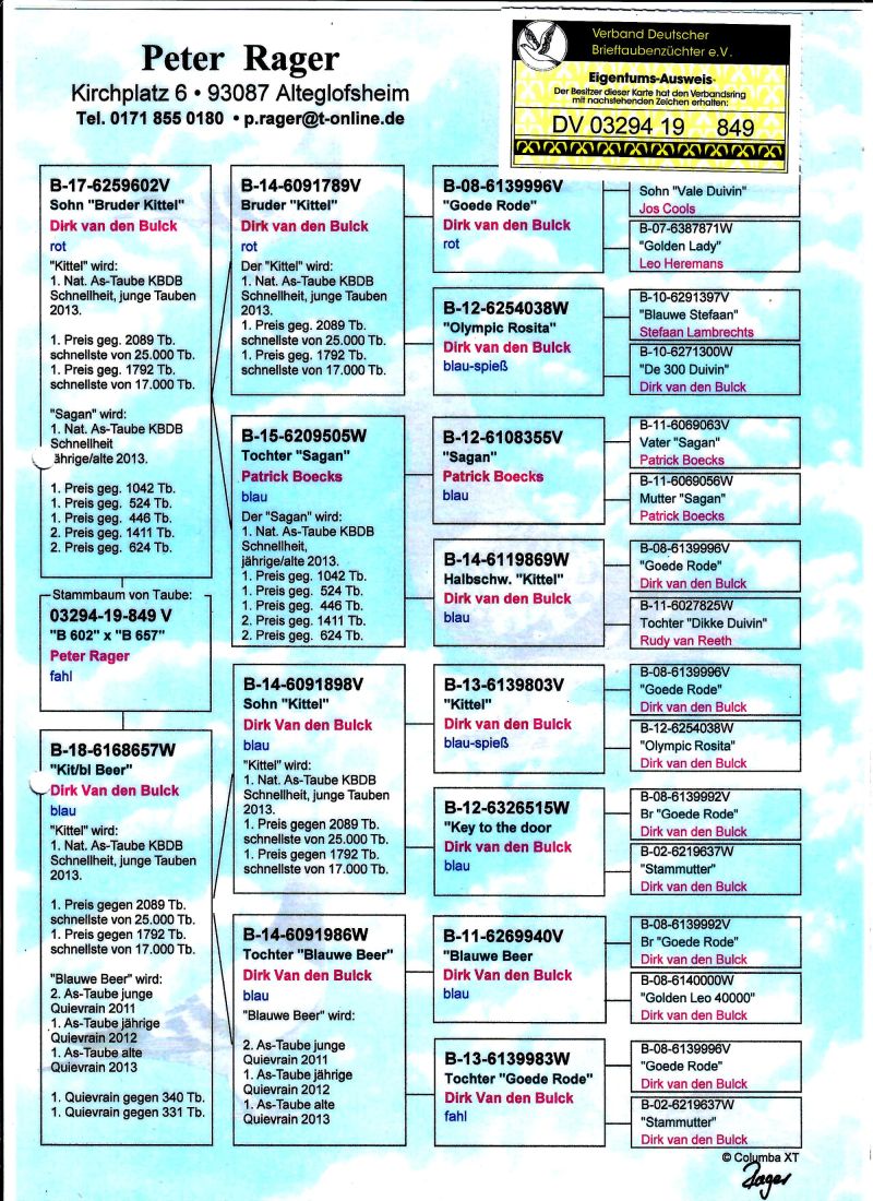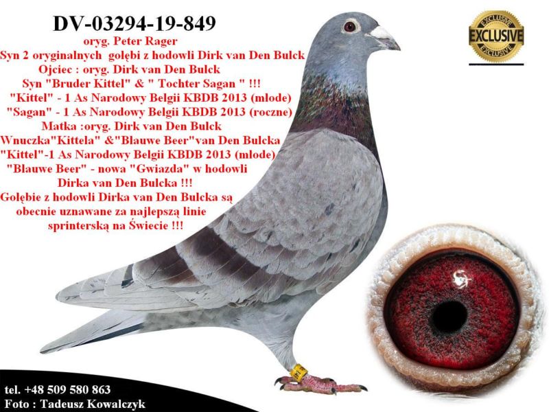 Gołąb z hodowli słynnego Petera Ragera . Inbred na "Kittela" & " Olympic Rosita " z hodowli Dirka van Den Bulcka . Oboje rodzice to oryginalne gołebie z hodowli Dirka van Den Bulcka . W pochodzeniu można znaleść takie gołebie jak : "Kittel" - 1 As Narodowy Belgii , "Olympic Rosita" - Olimpijczyk , "Sagan" - 1 Narodowy As Belgii , "Blauwe Beer " - 2 As gołębi młodych . Po prostu sam Top hodowli Dirka van Den Bulcka .