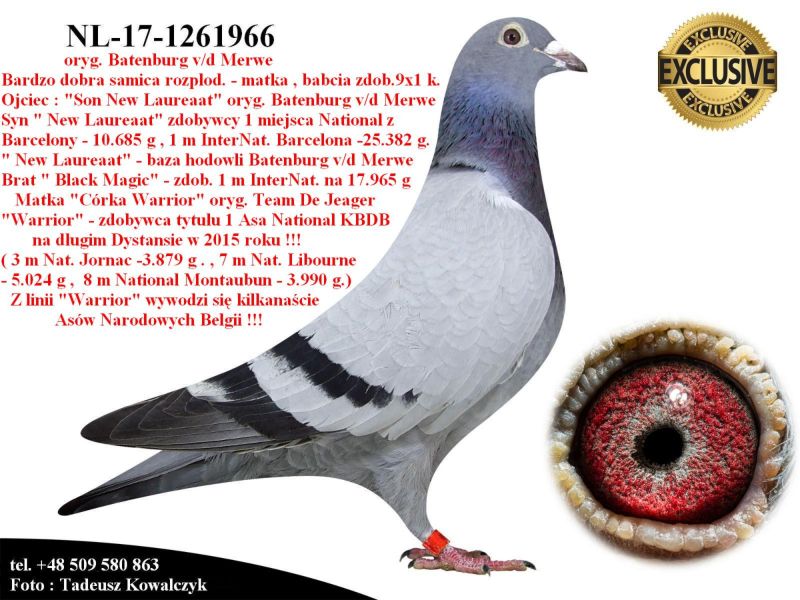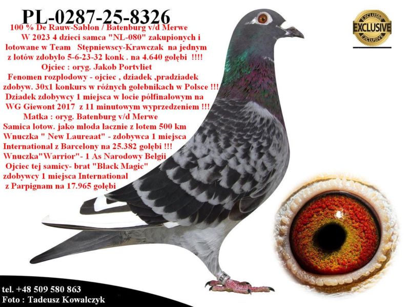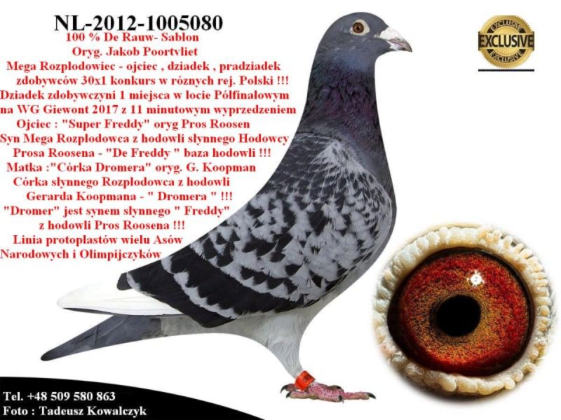 AUKCJA PROMOCYJNA ROCZNIKA 2025 (Cena obowiązuje wyłącznie na tej aukcji) Profesjonalna hodowla z wieloletnim doświadczeniem, posiadająca w swoim stadzie materiał najwyższej światowej klasy, wywodzący się od takich hodowców jak: Jan Hooymans, Gerard Koopman, Mike Ganus, Tjeerd & Jouke Elzinga, Gino Clicque, Jos Vercammen, Jelle Roziers, Bart Geerinckx, Batenburg – v/d Merwe, Altmiks – Pigeons, Jo & Florian Hendriks, Kornelis Winner Loft – linia „Romario”, W & F Ebben, Bert Braspenning, Dirk van den Bulck, Peter v/d Merwe, Jan van de Pasch, Van Elsacker-Jepsen, Roger Desmet – Matthijs, Arie Dijkstra, Leo Heremans, Pieter Veenstra, Gaby Vandenabeele, Karl-Heinz Wichert, Hardy Kruger, Helmut & Alfons Klaas, Gebr. Janssen. Najwyższej klasy materiał hodowlany – najlepsze linie danych Hodowców. Wszystkie wylicytowane gołębie będą dostarczane firmą kurierską.