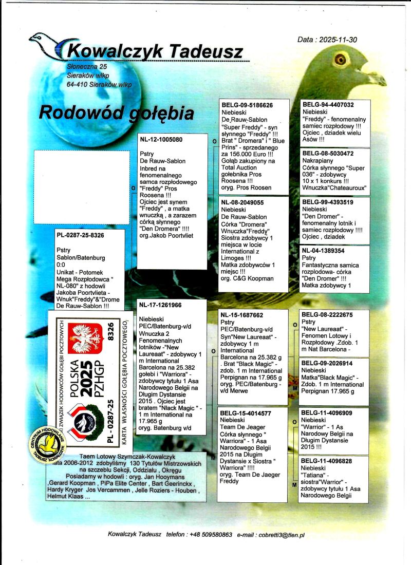 Płeć: młody gołąb Hodowca - rasa: Tadeusz Kowalczyk Zakończenie: 13.12.2025 godz. 20:46