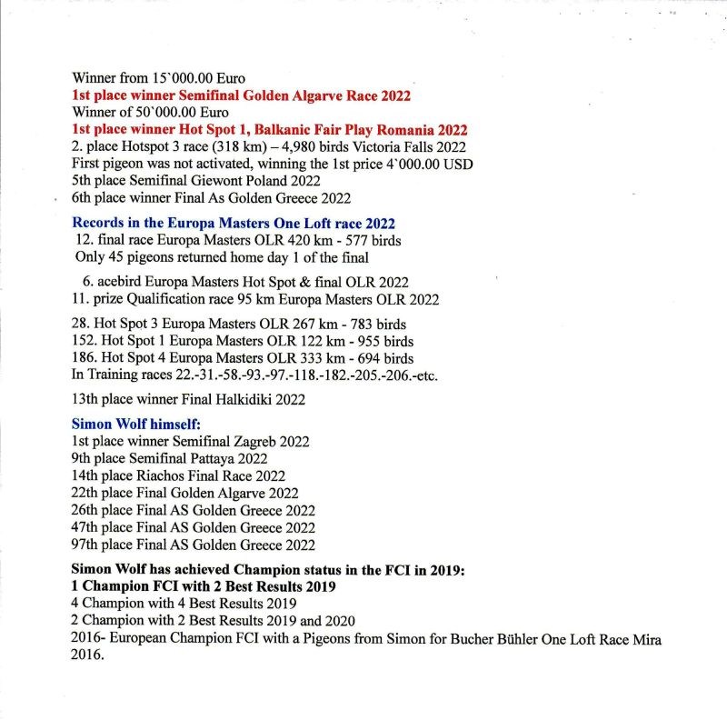 AUKCJA PROMOCYJNA ROCZNIKA 2025 (Cena obowiązuje wyłącznie na tej aukcji) Profesjonalna hodowla z wieloletnim doświadczeniem, posiadająca w swoim stadzie materiał najwyższej światowej klasy, wywodzący się od takich hodowców jak: Jan Hooymans, Gerard Koopman, Mike Ganus, Tjeerd & Jouke Elzinga, Gino Clicque, Jos Vercammen, Jelle Roziers, Bart Geerinckx, Batenburg – v/d Merwe, Altmiks – Pigeons, Jo & Florian Hendriks, Kornelis Winner Loft – linia „Romario”, W & F Ebben, Bert Braspenning, Dirk van den Bulck, Peter v/d Merwe, Jan van de Pasch, Van Elsacker-Jepsen, Roger Desmet – Matthijs, Arie Dijkstra, Leo Heremans, Pieter Veenstra, Gaby Vandenabeele, Karl-Heinz Wichert, Hardy Kruger, Helmut & Alfons Klaas, Gebr. Janssen. Najwyższej klasy materiał hodowlany – najlepsze linie danych Hodowców. Wszystkie wylicytowane gołębie będą dostarczane firmą kurierską.