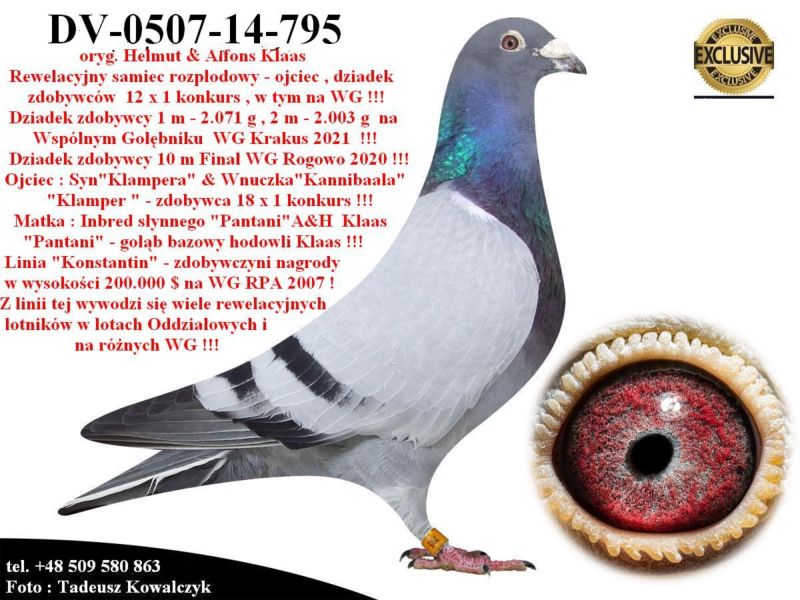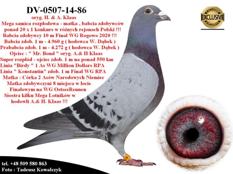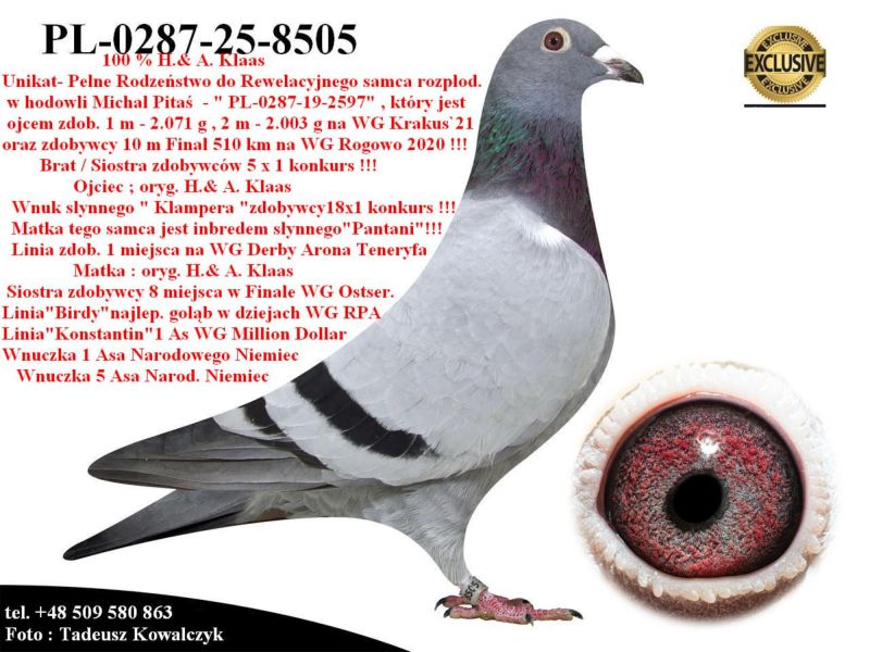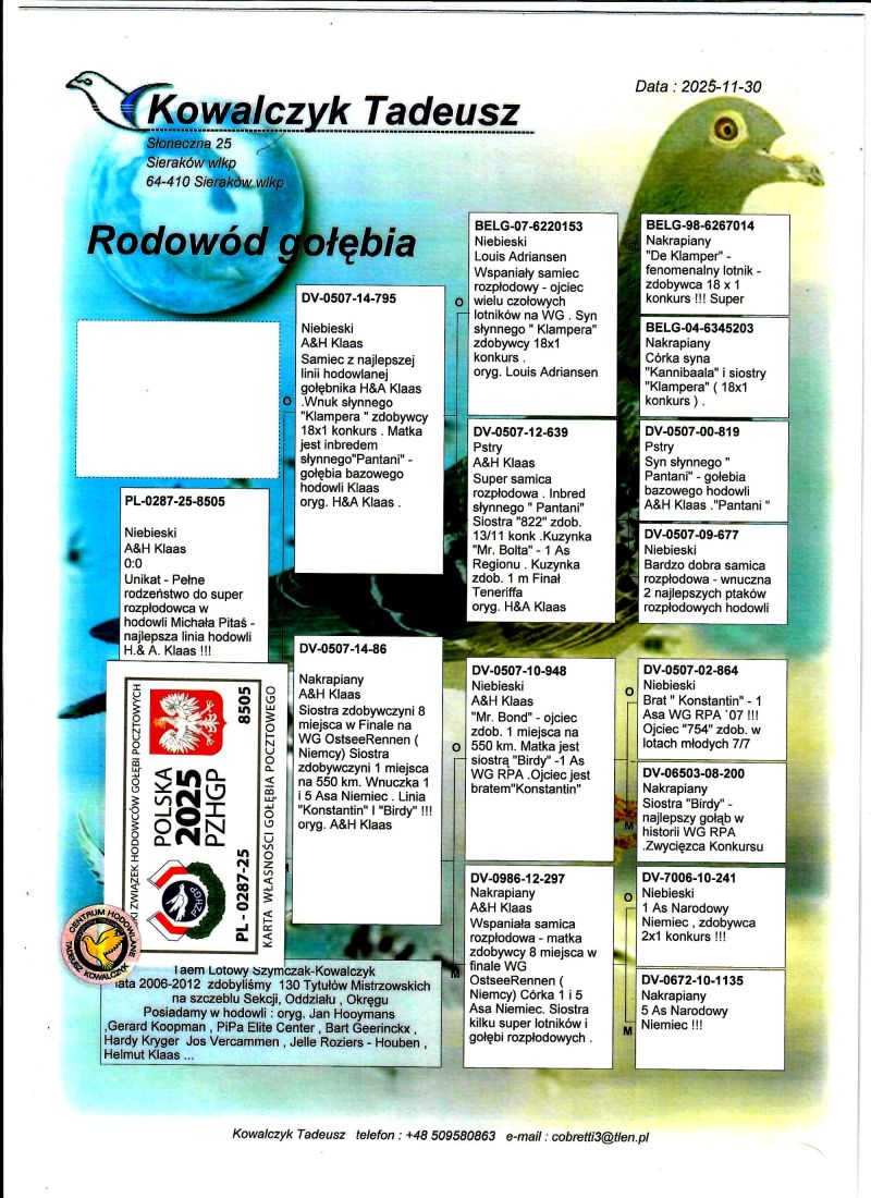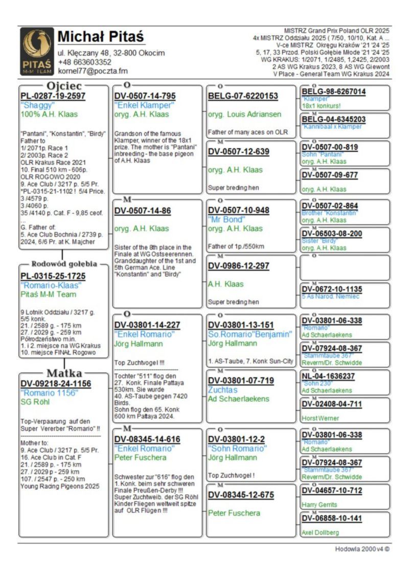 Gołąb ten miał pozostać w naszej hodowli . AUKCJA PROMOCYJNA ROCZNIKA 2025 (Cena obowiązuje wyłącznie na tej aukcji) Profesjonalna hodowla z wieloletnim doświadczeniem, posiadająca w swoim stadzie materiał najwyższej światowej klasy, wywodzący się od takich hodowców jak: Jan Hooymans, Gerard Koopman, Mike Ganus, Tjeerd & Jouke Elzinga, Gino Clicque, Jos Vercammen, Jelle Roziers, Bart Geerinckx, Batenburg – v/d Merwe, Altmiks – Pigeons, Jo & Florian Hendriks, Kornelis Winner Loft – linia „Romario”, W & F Ebben, Bert Braspenning, Dirk van den Bulck, Peter v/d Merwe, Jan van de Pasch, Van Elsacker-Jepsen, Roger Desmet – Matthijs, Arie Dijkstra, Leo Heremans, Pieter Veenstra, Gaby Vandenabeele, Karl-Heinz Wichert, Hardy Kruger, Helmut & Alfons Klaas, Gebr. Janssen. Najwyższej klasy materiał hodowlany – najlepsze linie danych Hodowców. Wszystkie wylicytowane gołębie będą dostarczane firmą kurierską.