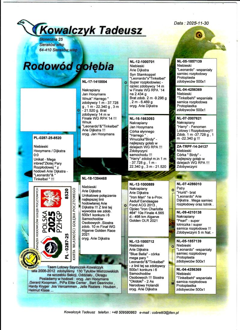 AUKCJA PROMOCYJNA ROCZNIKA 2025 (Cena obowiązuje wyłącznie na tej aukcji) Profesjonalna hodowla z wieloletnim doświadczeniem, posiadająca w swoim stadzie materiał najwyższej światowej klasy, wywodzący się od takich hodowców jak: Jan Hooymans, Gerard Koopman, Mike Ganus, Tjeerd & Jouke Elzinga, Gino Clicque, Jos Vercammen, Jelle Roziers, Bart Geerinckx, Batenburg – v/d Merwe, Altmiks – Pigeons, Jo & Florian Hendriks, Kornelis Winner Loft – linia „Romario”, W & F Ebben, Bert Braspenning, Dirk van den Bulck, Peter v/d Merwe, Jan van de Pasch, Van Elsacker-Jepsen, Roger Desmet – Matthijs, Arie Dijkstra, Leo Heremans, Pieter Veenstra, Gaby Vandenabeele, Karl-Heinz Wichert, Hardy Kruger, Helmut & Alfons Klaas, Gebr. Janssen. Najwyższej klasy materiał hodowlany – najlepsze linie danych Hodowców. Wszystkie wylicytowane gołębie będą dostarczane firmą kurierską.