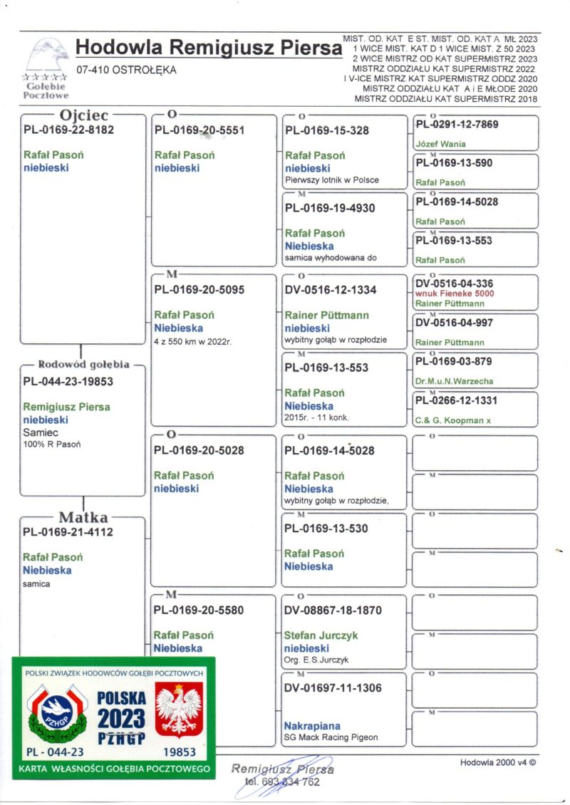 Oryginalny gołąb z hodowli Remigiusza Piersy . Szczegóły pochodzenia w rodowodzie. Dostawa gołębi będzie realizowana po zakończeniu aukcji kurierem lub odbiór osobisty. Więcej informacji pod nr tel.: 693334762