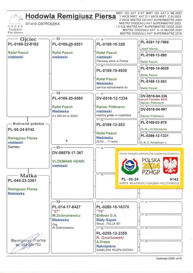 Oryginalny gołąb z hodowli Remigiusza Piersy . Szczegóły pochodzenia w rodowodzie. Dostawa gołębi będzie realizowana po zakończeniu aukcji kurierem lub odbiór osobisty. Więcej informacji pod nr tel.: 693334762