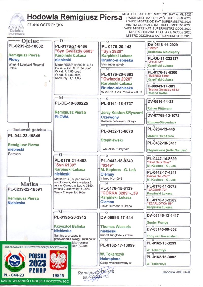 Oryginalny gołąb z hodowli Remigiusza Piersy . Szczegóły pochodzenia w rodowodzie. Dostawa gołębi będzie realizowana po zakończeniu aukcji kurierem lub odbiór osobisty. Więcej informacji pod nr tel.: 693334762