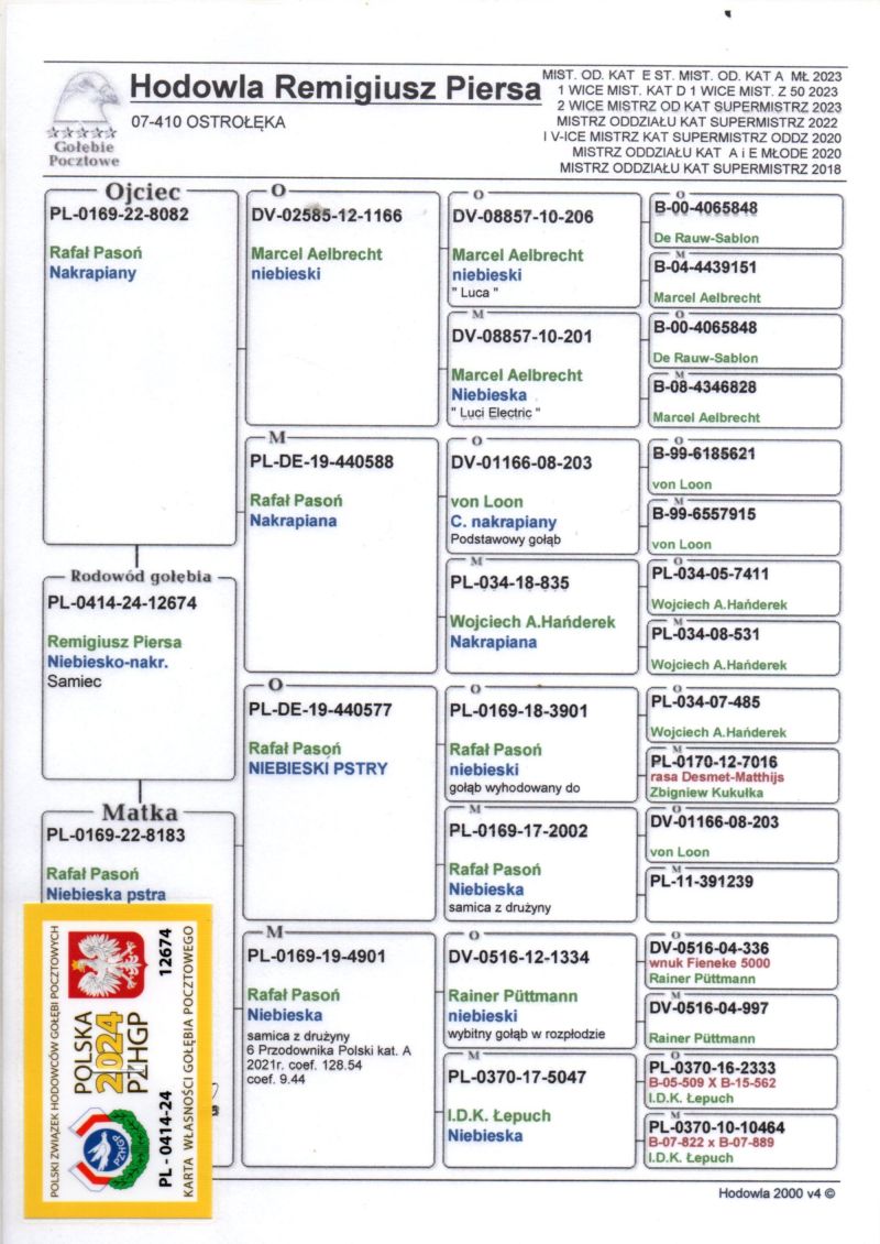 Oryginalny gołąb z hodowli Remigiusza Piersy . Szczegóły pochodzenia w rodowodzie. Dostawa gołębi będzie realizowana po zakończeniu aukcji kurierem lub odbiór osobisty. Więcej informacji pod nr tel.: 693334762