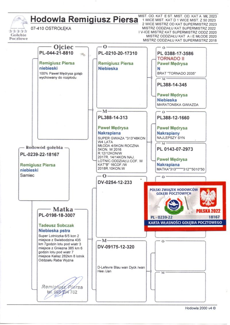 Oryginalny gołąb z hodowli Remigiusza Piersy . Szczegóły pochodzenia w rodowodzie. Dostawa gołębi będzie realizowana po zakończeniu aukcji kurierem lub odbiór osobisty. Więcej informacji pod nr tel.: 693334762