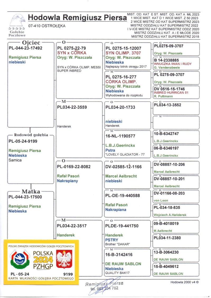 Oryginalny gołąb z hodowli Remigiusza Piersy . Szczegóły pochodzenia w rodowodzie. Dostawa gołębi będzie realizowana po zakończeniu aukcji kurierem lub odbiór osobisty. Więcej informacji pod nr tel.: 693334762
