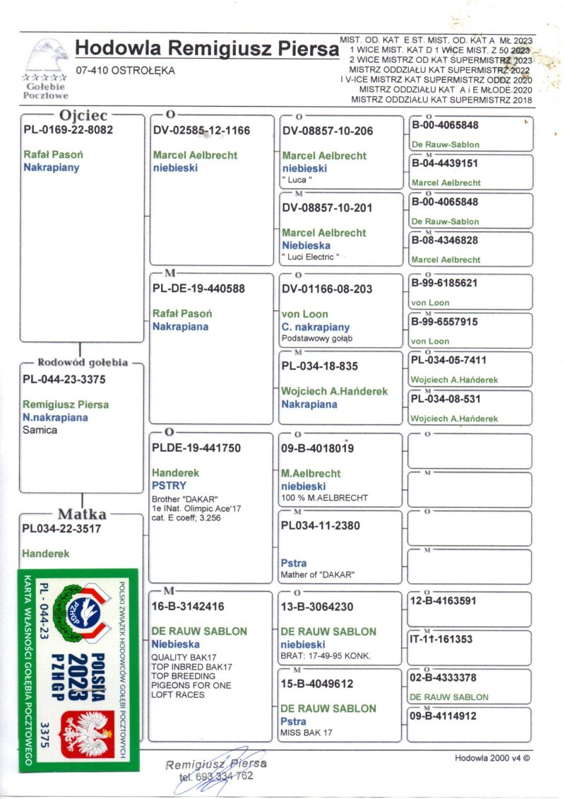 Oryginalny gołąb z hodowli Remigiusza Piersy . Szczegóły pochodzenia w rodowodzie. Dostawa gołębi będzie realizowana po zakończeniu aukcji kurierem lub odbiór osobisty. Więcej informacji pod nr tel.: 693334762