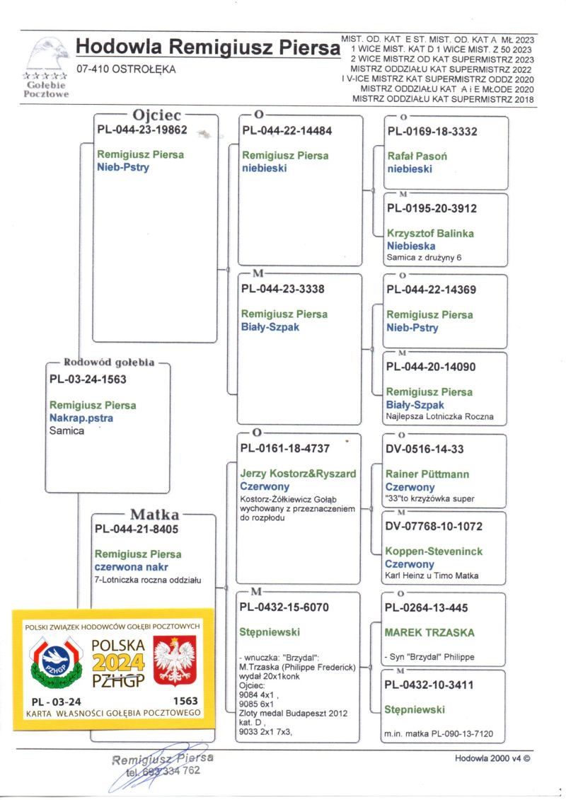 Oryginalny gołąb z hodowli Remigiusza Piersy . Szczegóły pochodzenia w rodowodzie. Dostawa gołębi będzie realizowana po zakończeniu aukcji kurierem lub odbiór osobisty. Więcej informacji pod nr tel.: 693334762