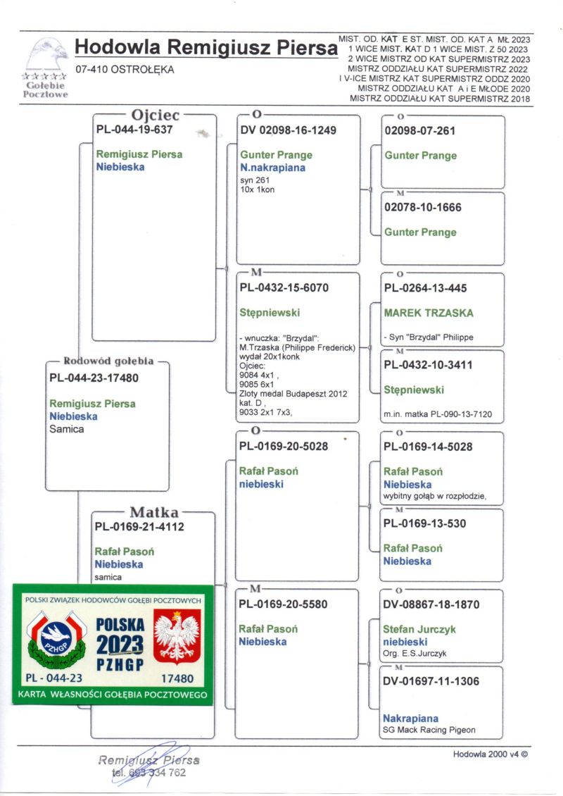 Oryginalny gołąb z hodowli Remigiusza Piersy . Szczegóły pochodzenia w rodowodzie. Dostawa gołębi będzie realizowana po zakończeniu aukcji kurierem lub odbiór osobisty. Więcej informacji pod nr tel.: 693334762