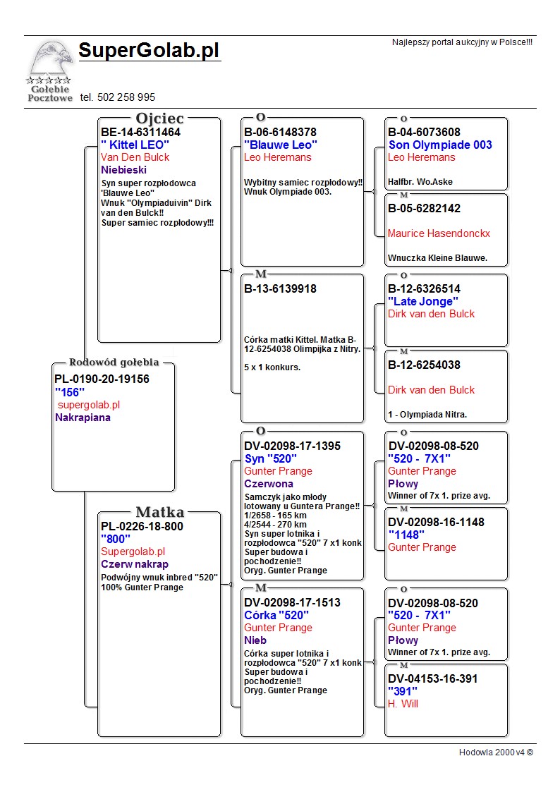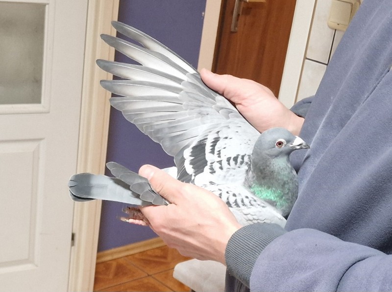 Oryginalny gołab z hodowli SuperGolab.pl. super pochodzednie!!! wnuczka najlepszego gołębia rozpłodowego Dirka van den Bulcka- Blauwe Leo, oraz podwójna prawnuczka 520 od Guntera Prange! MATKA: