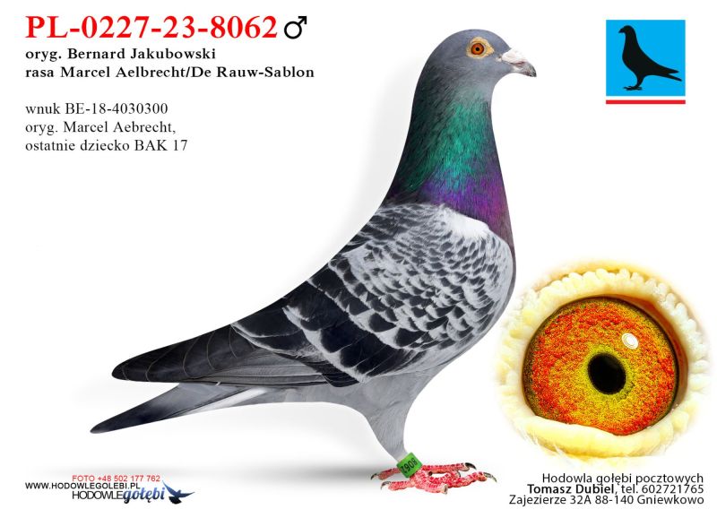 Prawdopodobnie Samica. z linii 550 x 107. Po gołębiach tych posiadam super gołębie rozpłodowe. W krótkim czasie ich dzieci jak i one same dały mi super lotniki, między innymi 2 i 3 lotnika oddziału, oraz wiele innych wartościowych lotników w lotach młodych i starych. Przepiękne gołębie na wymagające loty. Najlepsze umięśnienie, super budowa i aksamitne upierzenie. Do tego super wyniki na WG. U mnie WG Bojano 2023 wnuk 12 miejsce półfinał, 2024 wnuk 34 miejsce półfinał. U innych hodowców 2022 roku córka 107 wydała 4 gołębia z finału WG Mazury! W 2024 syn 107 x 550 wydał 3 ASA długi dystans, 7 miejsce Super Finał 515 km!!! ****************************************** Moje stado opiera się na ptakach które w latach 2012-2016 pozwoliły mi wygrywać w oddziale i okręgu w różnych kategoriach, lecąc w 2 różnych oddziałach 036 i 0394. Najważniejsze osiągnięcia to Mistrz okręgu kat. C 49 miejsce w Polsce, II vice Mistrz okręgu kat. B i młode, Super Mistrz Oddziału. Wszystkie wyniki dokładnie opisane na końcu aukcji. Do lotowania wróciłem „na chwilę” w 2021 r. na nowym miejscu zamieszkania w bardzo ciężkim sezonie 3 x vice Mistrz Oddziału gołębi młodych. 2,5,11,16,19,22,23,27,28,40 pozycje w klasyfikacji lotników. 3 x Mistrz sekcji oraz XIII przodownika okręgu Bydgoszcz. Zacząłem też lotowanie na WG wysyłając po kilka sztuk na sezon. 2021 – konkursy na finałach na WG Krakus i Super Gołąb, 2022 - 14 miejsce Extra Finał 518 km WG Super Gołąb, 2023 – 11 miejsce Finał 502 km WG Bojano. 2024 - 4 miejsce Półfinał WG Tatry, WG Bojano 4 miejsce lot konkursowy, 34 miejsce Półfinał, 17 miejsce Drużyna, 54, 78, 79, 81 lotnik. Po moich gołębiach w 2024 ptaki wylatały: po pełnej parze 68 miejsce Finał Super Gołąb, po samcu 8 miejsce Extra Finał WG Warmia, po samicy 16 miejsce Finał WG Roztocze, po samcu 3 AS długi dystans i 7 miejsce Extra Finał MWG Giewont. 2025 31 lotnik Derby Carmelo Yupi, 43 miejsce Extra Finał WG Tatry, 12 miejsce Finał WG Carpatia, 40 miejsce Finał WG Krakus (56 seria na 849 hodowców 2/2 w konkursie z 3 wysłanych ptaków), po samicy ode mnie 24 miejsce Finał Corabia One Loft Race. ********************** Wszystkie gołębie przyjęły komplet szczepień(Pharmavac, salmovir + ospa). Więcej informacji w rodowodach, zapraszam też do kontaktu telefonicznego, mailowego bądź WhatsApp. ********************* TRANSPORT, ptaki zostaną dostarczone transportem prywatnym w połowie grudnia, cena 1-2 szt. 100 zł, 3-6 szt. 150 zł, 7 i więcej 200 zł. Koszty transportu płatne kierowcy, za gołębie kierowcy bądź na konto, jak wygodniej. Istnieje również możliwość wcześniejszej wysyłki kurierskiej w cenie 150 zł do 6 szt. Zapraszam również do odbioru osobistego.