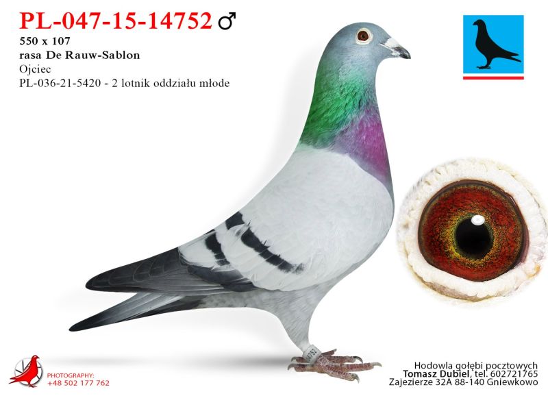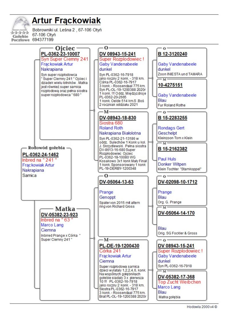 Prawdopodobnie samiczka, z łączenia jak 3 ASA długi dystans, 7 miejsce Super Finał 515 km!!! Rodzeństwo od stycznia będzie lotowane na Derby Carmelo Yupi w Hiszpani. Ojciec wydał też super lotnika który w bardzo ciężkich lotach oddziałowych zdobył tytuł 2 lotnika oddziału. Ptaki z linii 550 x 107. Po gołębiach tych posiadam super gołębie rozpłodowe. W krótkim czasie ich dzieci jak i one same dały mi super lotniki, między innymi 2 i 3 lotnika oddziału, oraz wiele innych wartościowych lotników w lotach młodych i starych. Przepiękne gołębie na wymagające loty. Najlepsze umięśnienie, super budowa i aksamitne upierzenie. Do tego super wyniki na WG. U mnie WG Bojano 2023 wnuk 12 miejsce półfinał, 2024 wnuk 34 miejsce półfinał. U innych hodowców 2022 roku córka 107 wydała 4 gołębia z finału WG Mazury! W 2024 syn 107 x 550 wydał 3 ASA długi dystans, 7 miejsce Super Finał 515 km!!! ****************************************** Moje stado opiera się na ptakach które w latach 2012-2016 pozwoliły mi wygrywać w oddziale i okręgu w różnych kategoriach, lecąc w 2 różnych oddziałach 036 i 0394. Najważniejsze osiągnięcia to Mistrz okręgu kat. C 49 miejsce w Polsce, II vice Mistrz okręgu kat. B i młode, Super Mistrz Oddziału. Wszystkie wyniki dokładnie opisane na końcu aukcji. Do lotowania wróciłem „na chwilę” w 2021 r. na nowym miejscu zamieszkania w bardzo ciężkim sezonie 3 x vice Mistrz Oddziału gołębi młodych. 2,5,11,16,19,22,23,27,28,40 pozycje w klasyfikacji lotników. 3 x Mistrz sekcji oraz XIII przodownika okręgu Bydgoszcz. Zacząłem też lotowanie na WG wysyłając po kilka sztuk na sezon. 2021 – konkursy na finałach na WG Krakus i Super Gołąb, 2022 - 14 miejsce Extra Finał 518 km WG Super Gołąb, 2023 – 11 miejsce Finał 502 km WG Bojano. 2024 - 4 miejsce Półfinał WG Tatry, WG Bojano 4 miejsce lot konkursowy, 34 miejsce Półfinał, 17 miejsce Drużyna, 54, 78, 79, 81 lotnik. Po moich gołębiach w 2024 ptaki wylatały: po pełnej parze 68 miejsce Finał Super Gołąb, po samcu 8 miejsce Extra Finał WG Warmia, po samicy 16 miejsce Finał WG Roztocze, po samcu 3 AS długi dystans i 7 miejsce Extra Finał MWG Giewont. 2025 31 lotnik Derby Carmelo Yupi, 43 miejsce Extra Finał WG Tatry, 12 miejsce Finał WG Carpatia, 40 miejsce Finał WG Krakus (56 seria na 849 hodowców 2/2 w konkursie z 3 wysłanych ptaków), po samicy ode mnie 24 miejsce Finał Corabia One Loft Race. ********************** Wszystkie gołębie przyjęły komplet szczepień(Pharmavac, salmovir + ospa). Więcej informacji w rodowodach, zapraszam też do kontaktu telefonicznego, mailowego bądź WhatsApp. ********************* TRANSPORT, ptaki zostaną dostarczone transportem prywatnym w połowie grudnia, cena 1-2 szt. 100 zł, 3-6 szt. 150 zł, 7 i więcej 200 zł. Koszty transportu płatne kierowcy, za gołębie kierowcy bądź na konto, jak wygodniej. Istnieje również możliwość wcześniejszej wysyłki kurierskiej w cenie 150 zł do 6 szt. Zapraszam również do odbioru osobistego.
