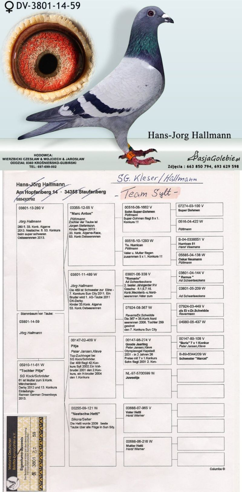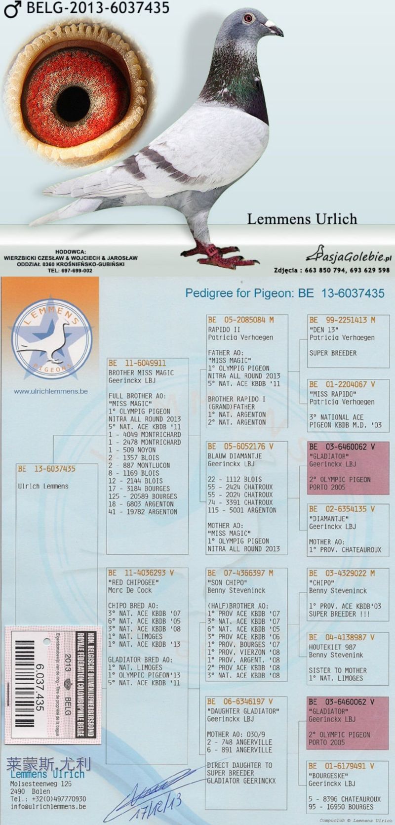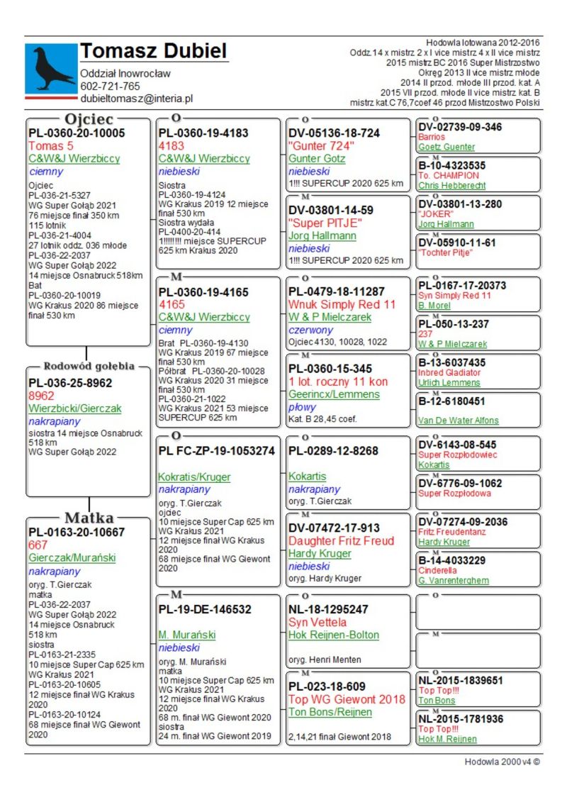 Bardzo fajny samczyk. Super pierwsze wrażenie i budowa. Bardzo spokojny gołąb. ****************************************** Dzieci tej Pary sprawdzają się w rozpłodzie. Moje stado opiera się na ptakach które w latach 2012-2016 pozwoliły mi wygrywać w oddziale i okręgu w różnych kategoriach, lecąc w 2 różnych oddziałach 036 i 0394. Najważniejsze osiągnięcia to Mistrz okręgu kat. C 49 miejsce w Polsce, II vice Mistrz okręgu kat. B i młode, Super Mistrz Oddziału. Wszystkie wyniki dokładnie opisane na końcu aukcji. Do lotowania wróciłem „na chwilę” w 2021 r. na nowym miejscu zamieszkania w bardzo ciężkim sezonie 3 x vice Mistrz Oddziału gołębi młodych. 2,5,11,16,19,22,23,27,28,40 pozycje w klasyfikacji lotników. 3 x Mistrz sekcji oraz XIII przodownika okręgu Bydgoszcz. Zacząłem też lotowanie na WG wysyłając po kilka sztuk na sezon. 2021 – konkursy na finałach na WG Krakus i Super Gołąb, 2022 - 14 miejsce Extra Finał 518 km WG Super Gołąb, 2023 – 11 miejsce Finał 502 km WG Bojano. 2024 - 4 miejsce Półfinał WG Tatry, WG Bojano 4 miejsce lot konkursowy, 34 miejsce Półfinał, 17 miejsce Drużyna, 54, 78, 79, 81 lotnik. Po moich gołębiach w 2024 ptaki wylatały: po pełnej parze 68 miejsce Finał Super Gołąb, po samcu 8 miejsce Extra Finał WG Warmia, po samicy 16 miejsce Finał WG Roztocze, po samcu 3 AS długi dystans i 7 miejsce Extra Finał MWG Giewont. 2025 31 lotnik Derby Carmelo Yupi, 43 miejsce Extra Finał WG Tatry, 12 miejsce Finał WG Carpatia, 40 miejsce Finał WG Krakus (56 seria na 849 hodowców 2/2 w konkursie z 3 wysłanych ptaków), po samicy ode mnie 24 miejsce Finał Corabia One Loft Race. ********************** Wszystkie gołębie przyjęły komplet szczepień(Pharmavac, salmovir + ospa). Więcej informacji w rodowodach, zapraszam też do kontaktu telefonicznego, mailowego bądź WhatsApp. ********************* TRANSPORT, ptaki zostaną dostarczone transportem prywatnym na początku grudnia, cena 1-2 szt. 100 zł, 3-6 szt. 150 zł, 7 i więcej 200 zł. Koszty transportu płatne kierowcy, za gołębie kierowcy bądź na konto, jak wygodniej. Istnieje również możliwość wcześniejszej wysyłki kurierskiej w cenie 150 zł do 6 szt. Zapraszam również do odbioru osobistego.