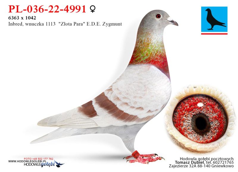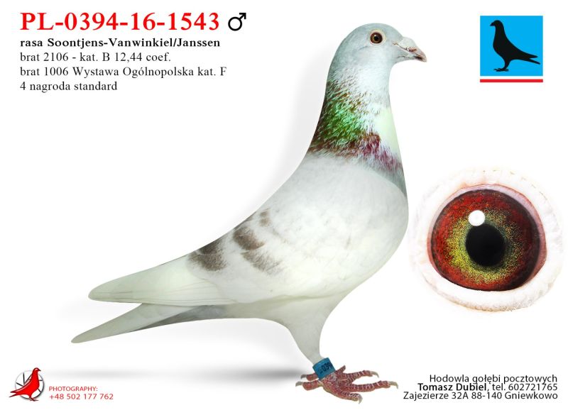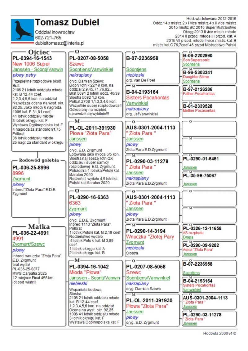 Bardzo fajny samczyk. Super budowa i pierwsze wrażenie. Córka "Złotej Pary" E.D.E. Zygmunt w połączeniu z super samcem od Damiana Szewca z linii olimpijki kat. C „Pocahontas” Jefa Vanwilkel dały mi wybitne lotniki i gołębie rozpłodowe. Ptaki te zdobyły u mnie wiele czołowych nagród w lotach w różnych kategoriach, oraz na wystawach. Samiczka z „moich Zygmuntów” jest babką 1 lotnika oddziału 2024 i 5 lotnika oddziału 2023 u rodziny Zygmunt. W 2025 samczyk z tych gołębi wydał 12 gołębia z finału na WG Carpati. ****************************************** Moje stado opiera się na ptakach które w latach 2012-2016 pozwoliły mi wygrywać w oddziale i okręgu w różnych kategoriach, lecąc w 2 różnych oddziałach 036 i 0394. Najważniejsze osiągnięcia to Mistrz okręgu kat. C 49 miejsce w Polsce, II vice Mistrz okręgu kat. B i młode, Super Mistrz Oddziału. Wszystkie wyniki dokładnie opisane na końcu aukcji. Do lotowania wróciłem „na chwilę” w 2021 r. na nowym miejscu zamieszkania w bardzo ciężkim sezonie 3 x vice Mistrz Oddziału gołębi młodych. 2,5,11,16,19,22,23,27,28,40 pozycje w klasyfikacji lotników. 3 x Mistrz sekcji oraz XIII przodownika okręgu Bydgoszcz. Zacząłem też lotowanie na WG wysyłając po kilka sztuk na sezon. 2021 – konkursy na finałach na WG Krakus i Super Gołąb, 2022 - 14 miejsce Extra Finał 518 km WG Super Gołąb, 2023 – 11 miejsce Finał 502 km WG Bojano. 2024 - 4 miejsce Półfinał WG Tatry, WG Bojano 4 miejsce lot konkursowy, 34 miejsce Półfinał, 17 miejsce Drużyna, 54, 78, 79, 81 lotnik. Po moich gołębiach w 2024 ptaki wylatały: po pełnej parze 68 miejsce Finał Super Gołąb, po samcu 8 miejsce Extra Finał WG Warmia, po samicy 16 miejsce Finał WG Roztocze, po samcu 3 AS długi dystans i 7 miejsce Extra Finał MWG Giewont. 2025 31 lotnik Derby Carmelo Yupi, 43 miejsce Extra Finał WG Tatry, 12 miejsce Finał WG Carpatia, 40 miejsce Finał WG Krakus (56 seria na 849 hodowców 2/2 w konkursie z 3 wysłanych ptaków), po samicy ode mnie 24 miejsce Finał Corabia One Loft Race. ********************** Wszystkie gołębie przyjęły komplet szczepień(Pharmavac, salmovir + ospa). Więcej informacji w rodowodach, zapraszam też do kontaktu telefonicznego, mailowego bądź WhatsApp. ********************* TRANSPORT, ptaki zostaną dostarczone transportem prywatnym w połowie grudnia, cena 1-2 szt. 100 zł, 3-6 szt. 150 zł, 7 i więcej 200 zł. Koszty transportu płatne kierowcy, za gołębie kierowcy bądź na konto, jak wygodniej. Istnieje również możliwość wcześniejszej wysyłki kurierskiej w cenie 150 zł do 6 szt. Zapraszam również do odbioru osobistego.
