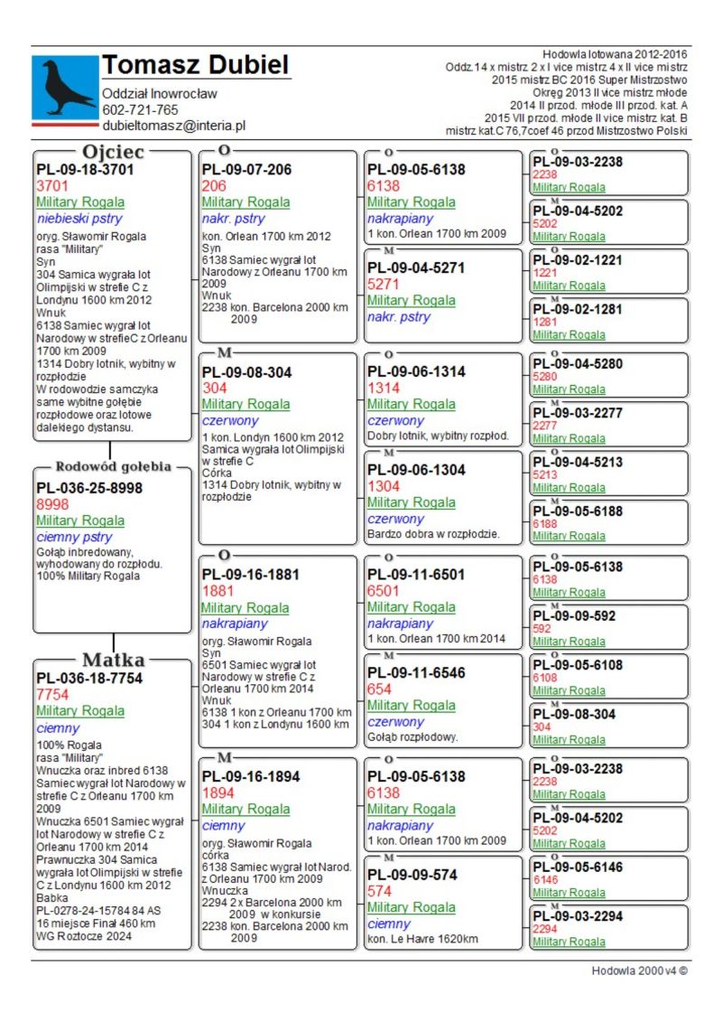 Samiec. Rodzeństwo od stycznia będzie lotowane na Derby Carmelo Yupi w Hiszpani. Para wyselekcjonowana po kilku latach z wielu gołębi w rasie. Bardzo twarde gołębie. ****************************************** Moje stado opiera się na ptakach które w latach 2012-2016 pozwoliły mi wygrywać w oddziale i okręgu w różnych kategoriach, lecąc w 2 różnych oddziałach 036 i 0394. Najważniejsze osiągnięcia to Mistrz okręgu kat. C 49 miejsce w Polsce, II vice Mistrz okręgu kat. B i młode, Super Mistrz Oddziału. Wszystkie wyniki dokładnie opisane na końcu aukcji. Do lotowania wróciłem „na chwilę” w 2021 r. na nowym miejscu zamieszkania w bardzo ciężkim sezonie 3 x vice Mistrz Oddziału gołębi młodych. 2,5,11,16,19,22,23,27,28,40 pozycje w klasyfikacji lotników. 3 x Mistrz sekcji oraz XIII przodownika okręgu Bydgoszcz. Zacząłem też lotowanie na WG wysyłając po kilka sztuk na sezon. 2021 – konkursy na finałach na WG Krakus i Super Gołąb, 2022 - 14 miejsce Extra Finał 518 km WG Super Gołąb, 2023 – 11 miejsce Finał 502 km WG Bojano. 2024 - 4 miejsce Półfinał WG Tatry, WG Bojano 4 miejsce lot konkursowy, 34 miejsce Półfinał, 17 miejsce Drużyna, 54, 78, 79, 81 lotnik. Po moich gołębiach w 2024 ptaki wylatały: po pełnej parze 68 miejsce Finał Super Gołąb, po samcu 8 miejsce Extra Finał WG Warmia, po samicy 16 miejsce Finał WG Roztocze, po samcu 3 AS długi dystans i 7 miejsce Extra Finał MWG Giewont. 2025 31 lotnik Derby Carmelo Yupi, 43 miejsce Extra Finał WG Tatry, 12 miejsce Finał WG Carpatia, 40 miejsce Finał WG Krakus (56 seria na 849 hodowców 2/2 w konkursie z 3 wysłanych ptaków), po samicy ode mnie 24 miejsce Finał Corabia One Loft Race. ********************** Wszystkie gołębie przyjęły komplet szczepień(Pharmavac, salmovir + ospa). Więcej informacji w rodowodach, zapraszam też do kontaktu telefonicznego, mailowego bądź WhatsApp. ********************* TRANSPORT, ptaki zostaną dostarczone transportem prywatnym w połowie grudnia, cena 1-2 szt. 100 zł, 3-6 szt. 150 zł, 7 i więcej 200 zł. Koszty transportu płatne kierowcy, za gołębie kierowcy bądź na konto, jak wygodniej. Istnieje również możliwość wcześniejszej wysyłki kurierskiej w cenie 150 zł do 6 szt. Zapraszam również do odbioru osobistego.