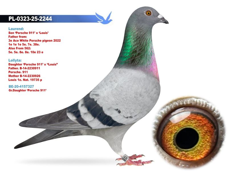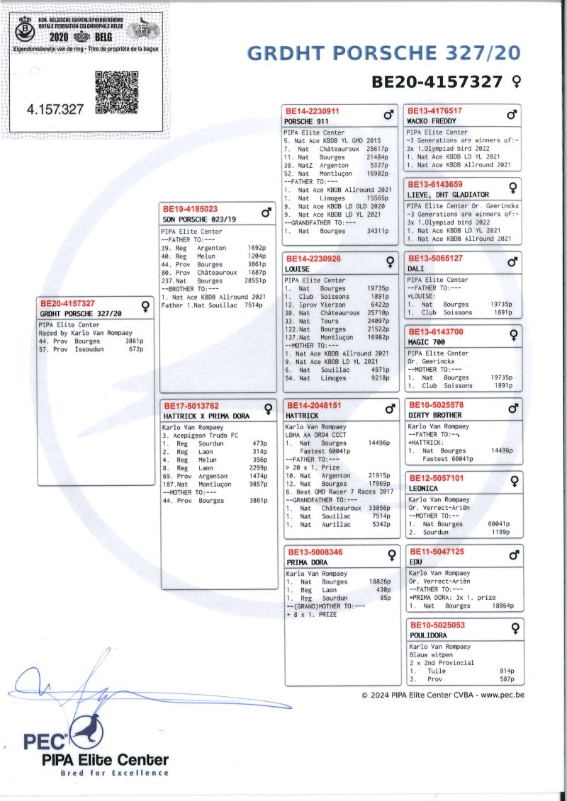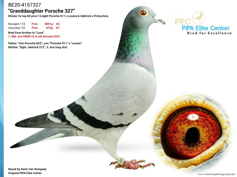 Ojciec oferowanego gołębia to wnuk PORSCHE 911 z hodowli A.Drapa , matka natomiast to wnuczka PORSCHE 911 lotowana w Belgi, zakupiona z PIPA.be . Oferowany gołąb to prawdopodobnie SAMICA. Koszt transportu 100 zł . Gołąb wychowany z boksu indywidualnego .