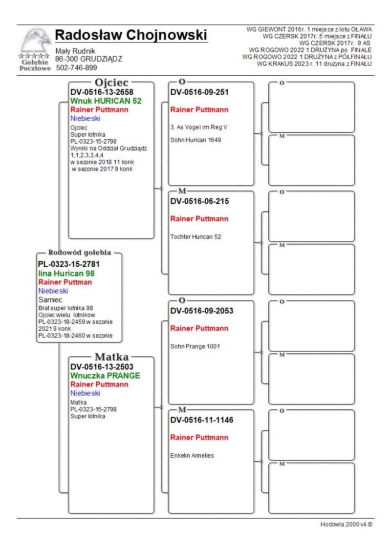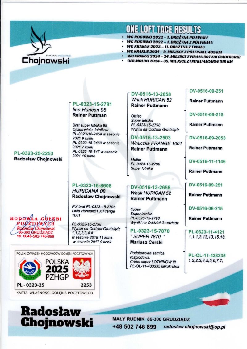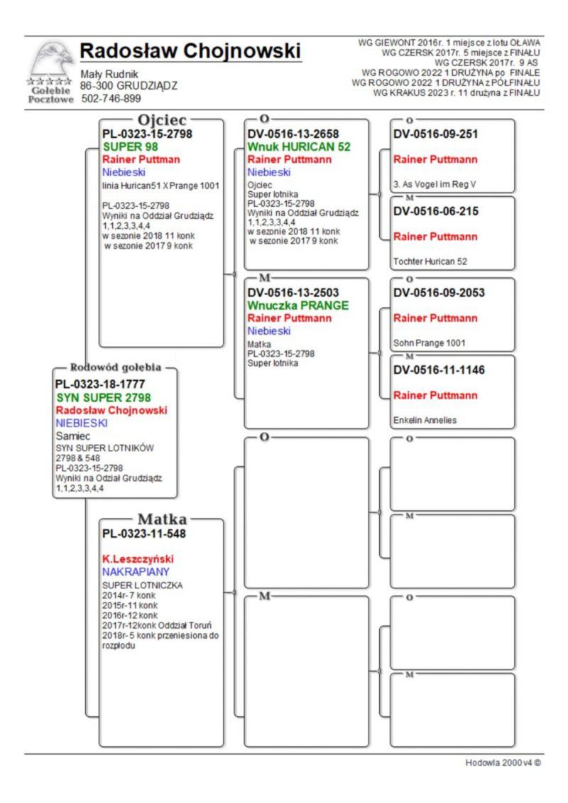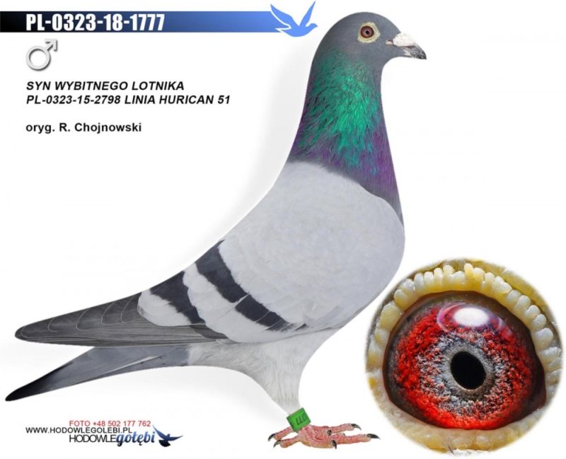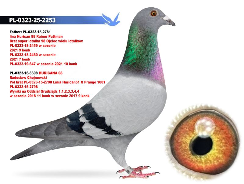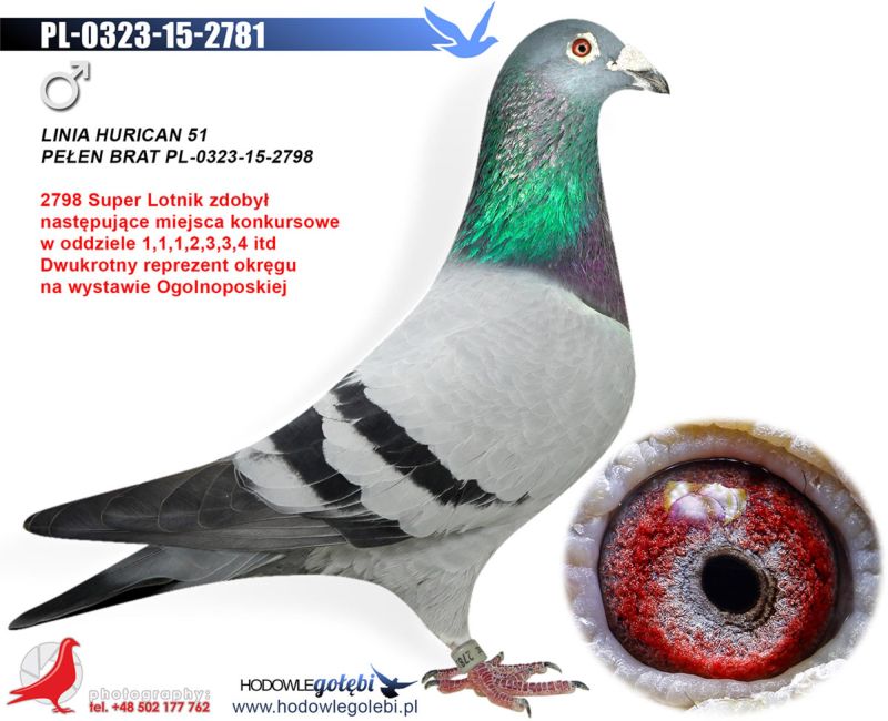 Ojciec oferowanego gołębia to pełen brat wybitnego lotnika PL-0323-15-2798 1,1,2,3,3,4,4 konk na Odział G-dz. Matka to pół siostra do PL-0323-15-2798. Oferowany gołąb to prawdopodobnie SAMCZYK. Koszt transportu 100 zł .