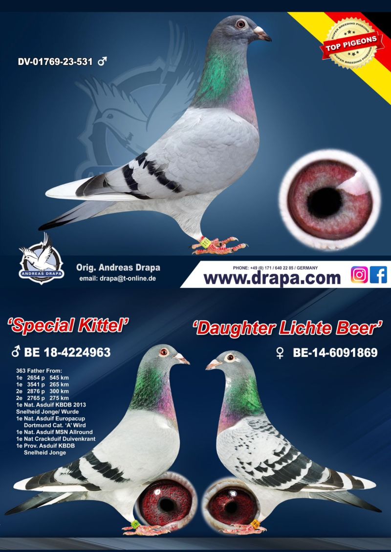 Ojciec oferowanego gołębia to syn RAGNAR z hodowli A. Drapa, matka to wnuczka De Kittel z hodowli A. Drapa. Oferowany gołąb to prawdopodobnie SAMICZKA. Koszt transportu 100 zł .