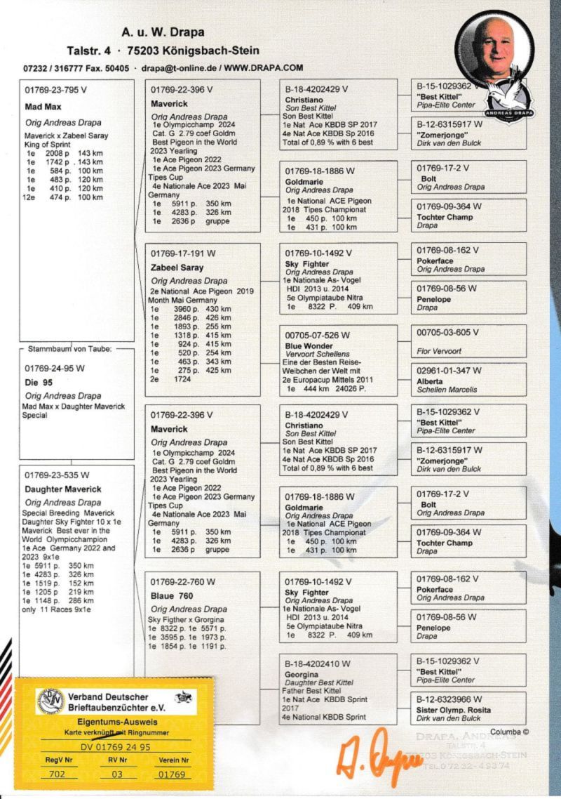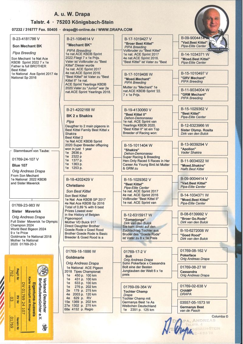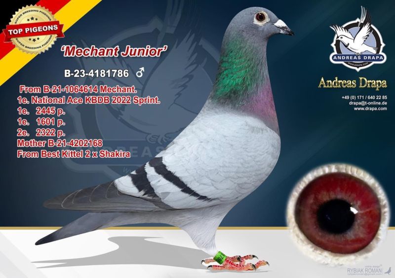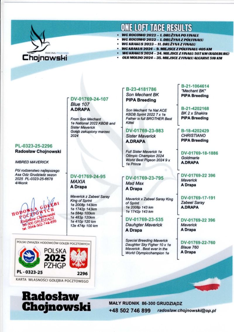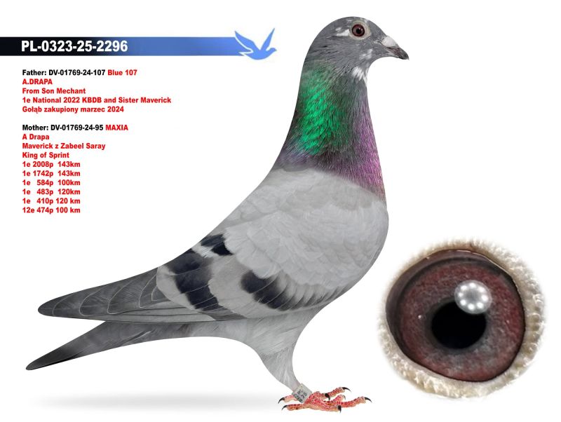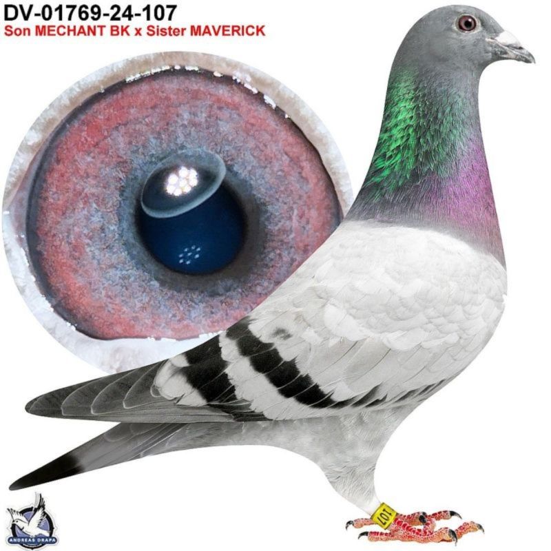 Ojciec oferowanego gołębia to syn siostry MAVERICK, a zarazem wnuk MECHANT 1 ACE KBDB sprintu Belgi w 2022r. , matka to wnuczka MAVERICK złotego medalisty z hodowli A.Drapa. Oferowany gołąb to prawdopodobnie SAMCZYK. Koszt transportu 100 zł .