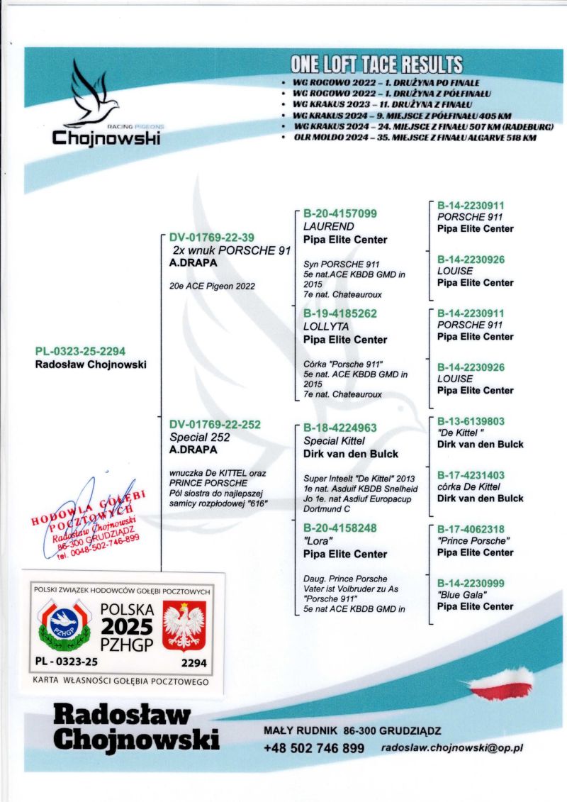 Ojciec oferowanego gołębia to wnuk PORSCHE 911 z hodowli A.Drapa , matka natomiast to wnuczka PRINCE PORSCHE zakupiona z gołębnika A.Drapa . Oferowany gołąb to prawdopodobnie SAMIEC. Koszt transportu 100 zł . Gołąb wychowany z boksu indywidualnego .
