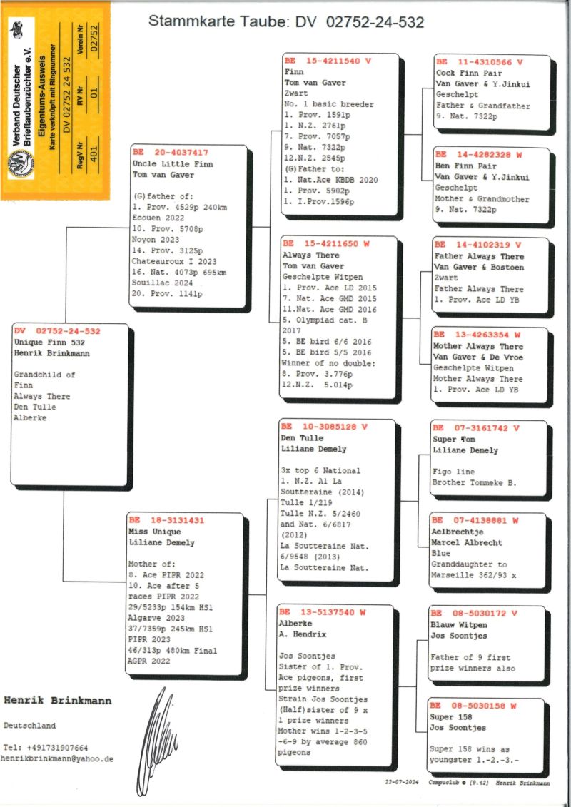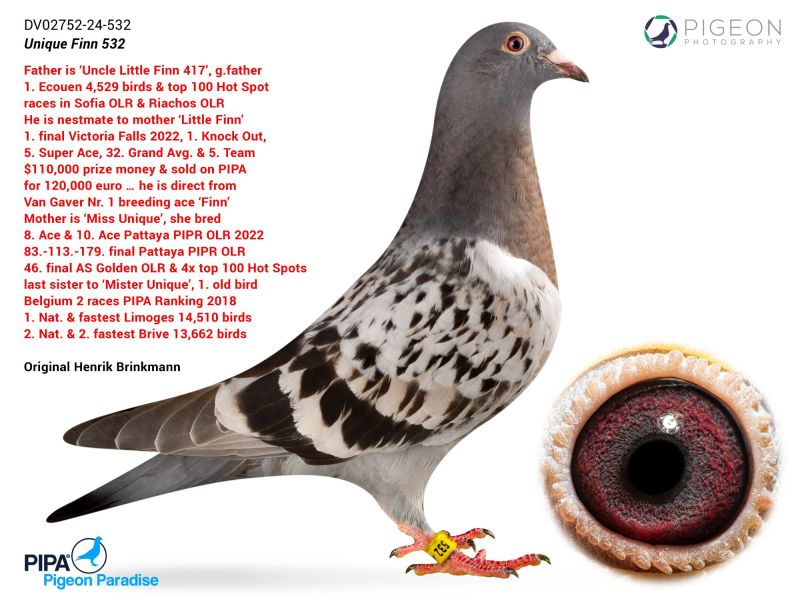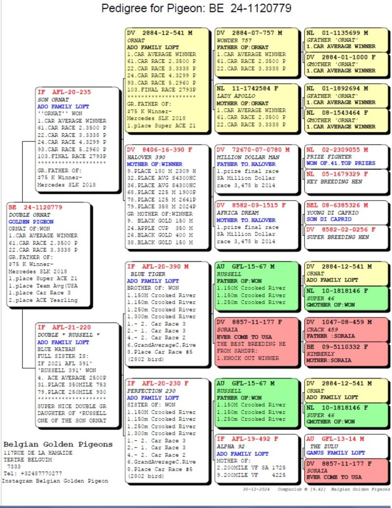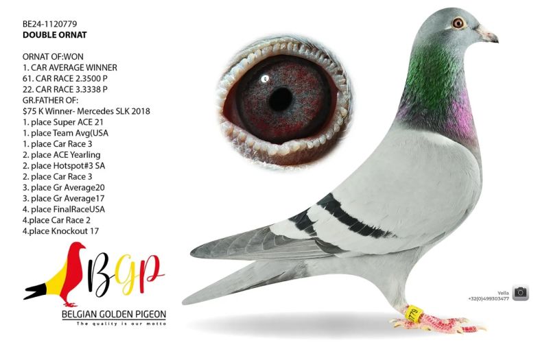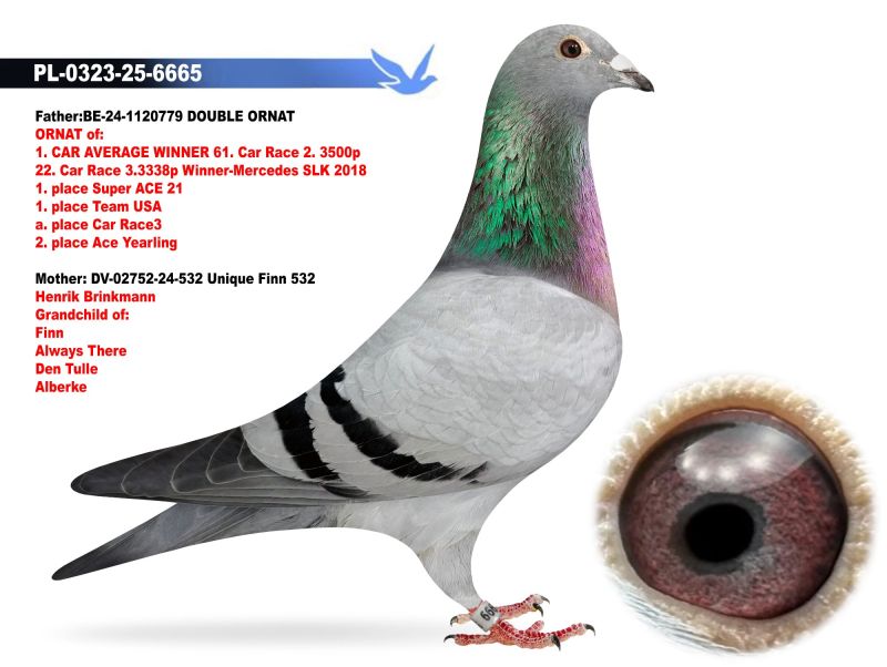Ojciec oferowanego gołębia to wnuk ORNAT, na tą chwile najlepszego gołębia rozpłodowego na Świecie pod kątem wyników osiągniętych przez jego potomstwo na wspólnych gołębnikach , matka natomiast to wnuczka FINN zakupiona na portalu PIPA be . Oferowany gołąb to prawdopodobnie SAMCZYK. Koszt transportu 100 zł .Gołąb wychowany z boksu indywidualnego