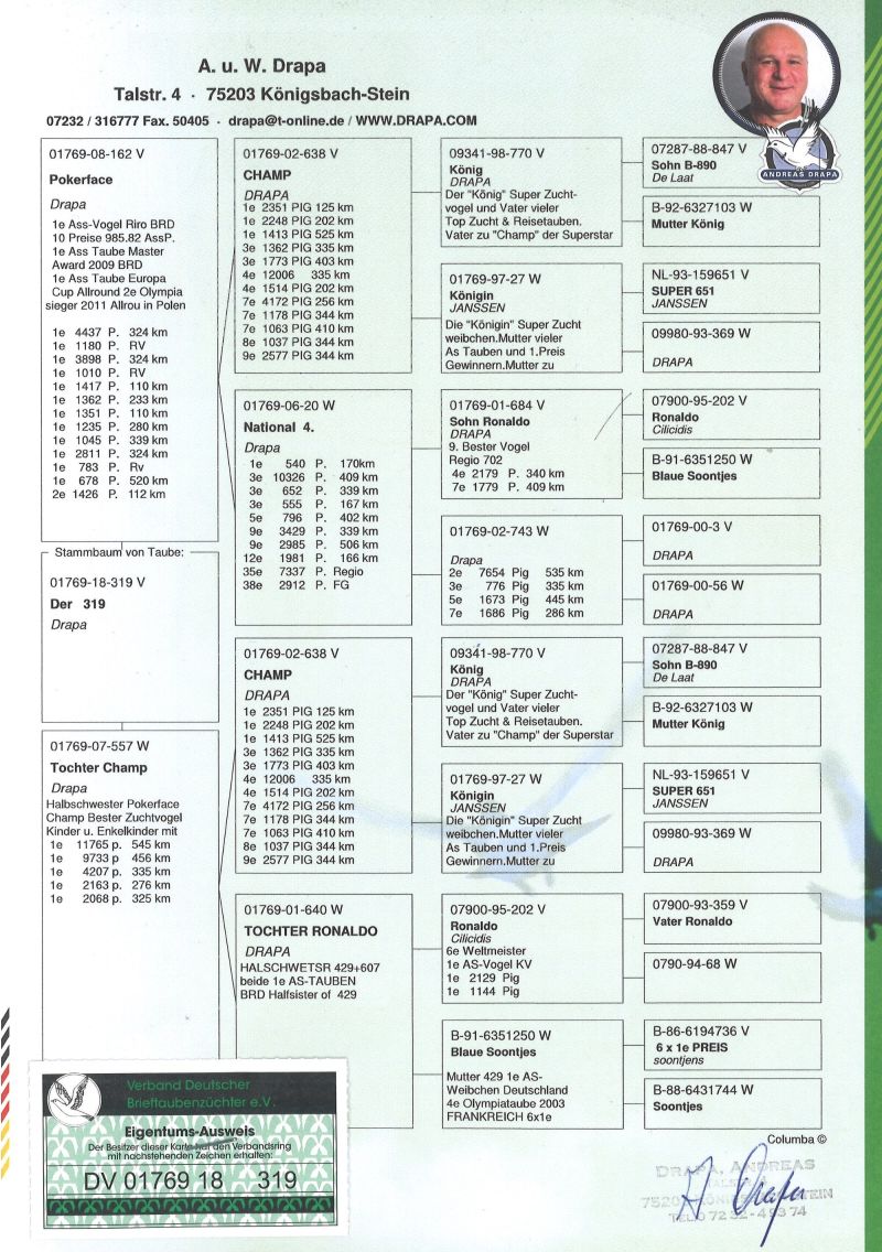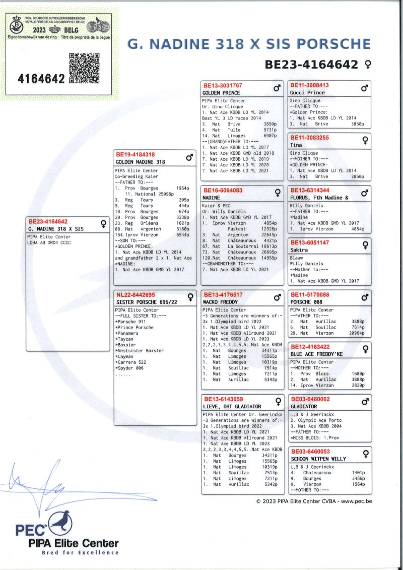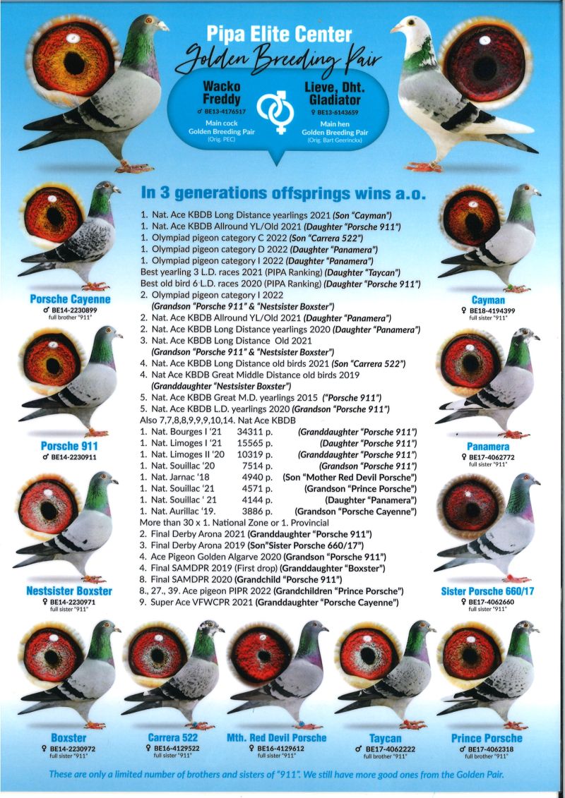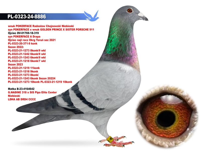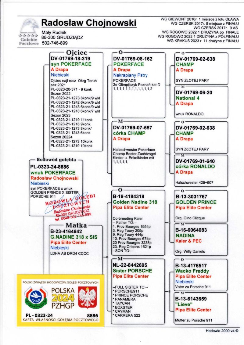 Ojciec oferowanego gołębia to SUPER 319 najlepszy gołąb rozpłodowy na mojej hodowli syn POKERFACE, matka to córka siostry PORSCHE 911 z PEC. Koszt transportu 100 zł .Gołąb wychowany z boksu indywidualnego.