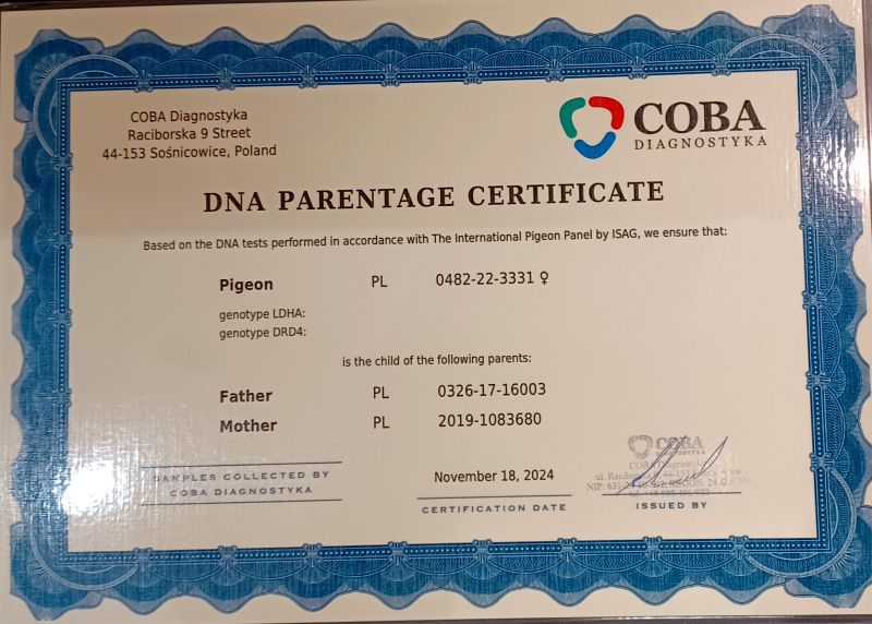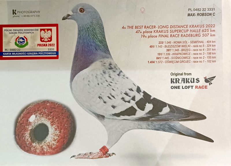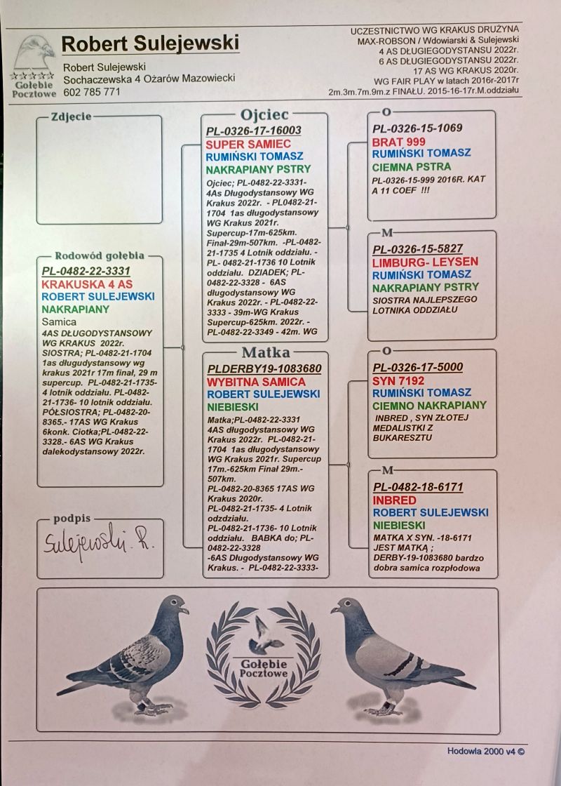 Oryginalny gołąb z hodowli Roberta Sulejewskiego. Pełna siostra 1 ASA długodystansowego WG Krakus, również ciotka do 6Asa długodystansowego WG Krakus. Rodzina bardzo dobrych lotników i rozpłodowców. Gołąb zaszczepiony, po kuracjach. Odbiór osobisty - wysyłka lub wystawa ogólnopolska. Rodzice posiadają certyfikat DNA. Rezygnacja z PZHGP. Więcej informacji pod numerem telefonu 602 785 771
