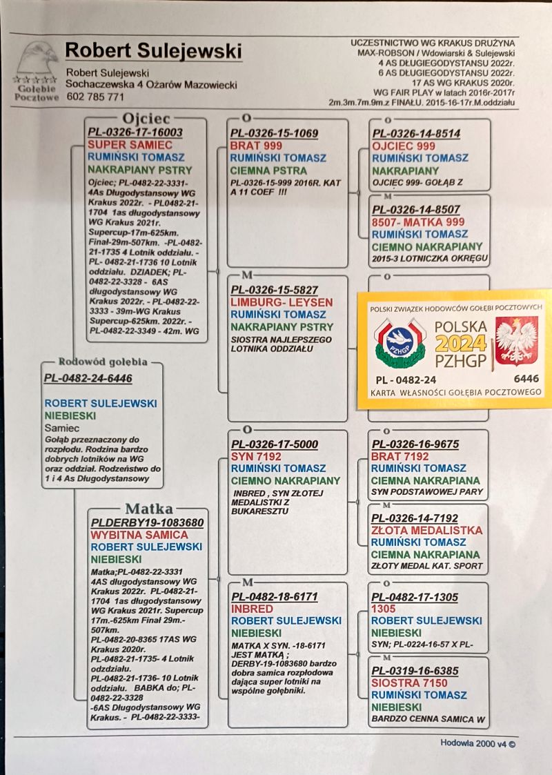 Oryginalny gołąb z hodowli Roberta Sulejewskiego. Pełne rodzeństwo do 1 Asa i 4 Asa długodystansowego WG Krakus. Rodzice oraz rodzeństwo posiadają certyfikat DNA. Gołąb zaszczepiony, po kuracjach. Odbiór osobisty - wysyłka lub wystawa ogólnopolska. Rezygnacja z PZHGP. Więcej informacji pod numerem telefonu 602 785 771
