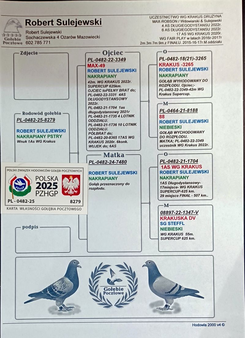 Oryginalny gołąb z hodowli Roberta Sulejewskiego. Wnuk 1 asa WG Krakus Gołąb zaszczepiony, po kuracjach. Odbiór osobisty - wysyłka lub wystawa ogólnopolska. Rezygnacja z PZHGP. Więcej informacji pod numerem telefonu 602 785 771