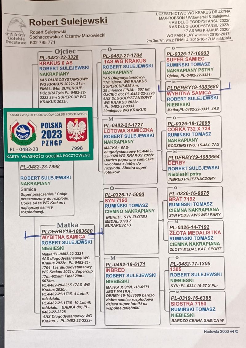 Oryginalny gołąb z hodowli Roberta Sulejewskiego. Łączenie babcia × wnuk. Rodzice posiadają certyfikat DNA Gołąb zaszczepiony, po kuracjach. Odbiór osobisty - wysyłka lub wystawa ogólnopolska. Rezygnacja z PZHGP. Więcej informacji pod numerem telefonu 602 785 771