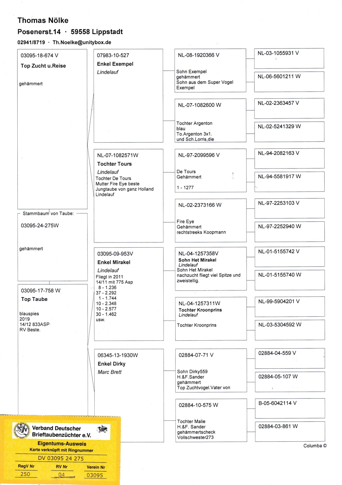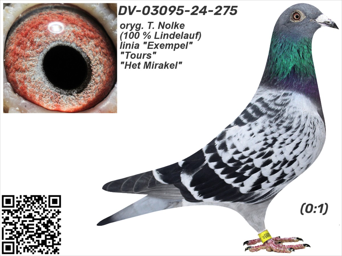 oryg. T. Nolke (100 % Lindelauf), linia "Exempel", "Tours", "Het Mirakel" Szczegóły pochodzenia w rodowodzie. Gołąb jest sprzedawany bezpośrednio od hodowcy i znajduje się w Polsce, można go obejrzeć w miejscowości Zblewo (woj. pomorskie), po wcześniejszym kontakcie telefonicznym. Więcej informacji o gołębiu i transporcie pod nr tel.: 511 607 710.