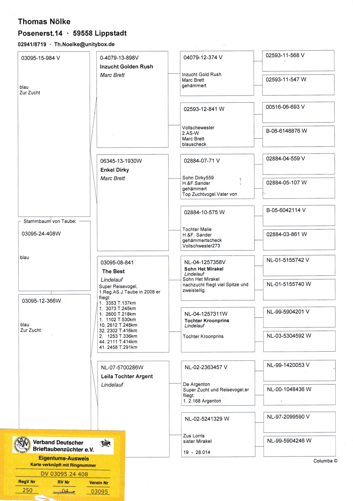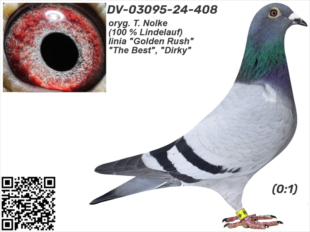 oryg. T. Nolke (100 % Lindelauf), linia "Golden Rush", "The Best", "Dirky" Szczegóły pochodzenia w rodowodzie. Gołąb jest sprzedawany bezpośrednio od hodowcy i znajduje się w Polsce, można go obejrzeć w miejscowości Zblewo (woj. pomorskie), po wcześniejszym kontakcie telefonicznym. Więcej informacji o gołębiu i transporcie pod nr tel.: 511 607 710.