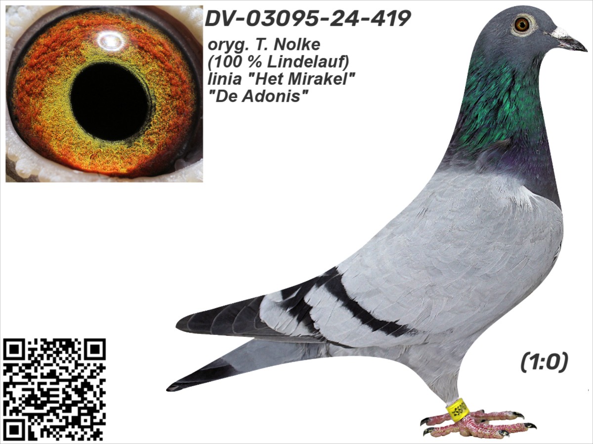 oryg. T. Nolke (100 % Lindelauf), linia "Het Mirakel", "De Adonis", 2 Mistrz Niemiec gołębi rocznych Szczegóły pochodzenia w rodowodzie. Gołąb jest sprzedawany bezpośrednio od hodowcy i znajduje się w Polsce, można go obejrzeć w miejscowości Zblewo (woj. pomorskie), po wcześniejszym kontakcie telefonicznym. Więcej informacji o gołębiu i transporcie pod nr tel.: 511 607 710.