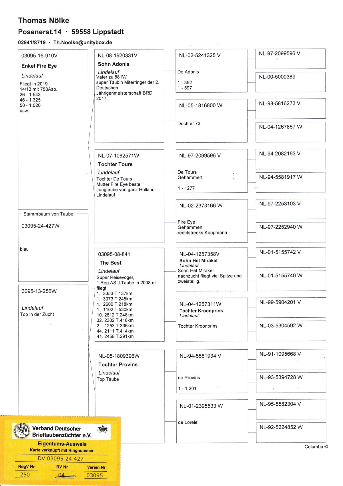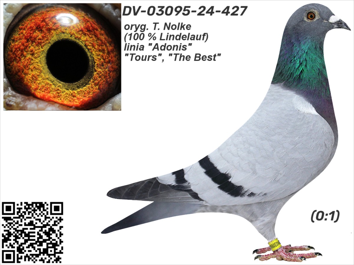oryg. T. Nolke (100 % Lindelauf), linia "Adonis", "Tours", "The Best" Szczegóły pochodzenia w rodowodzie. Gołąb jest sprzedawany bezpośrednio od hodowcy i znajduje się w Polsce, można go obejrzeć w miejscowości Zblewo (woj. pomorskie), po wcześniejszym kontakcie telefonicznym. Więcej informacji o gołębiu i transporcie pod nr tel.: 511 607 710.
