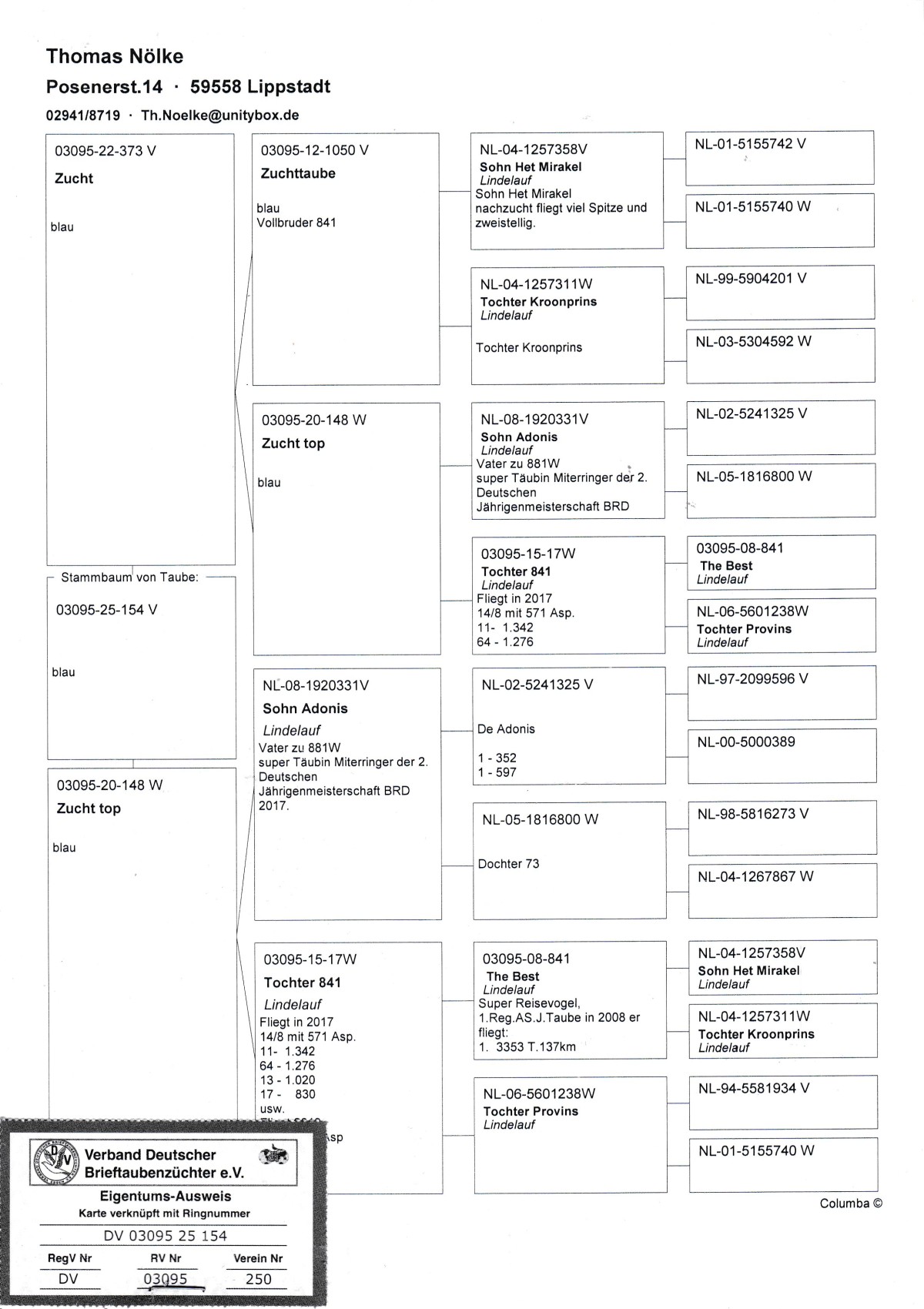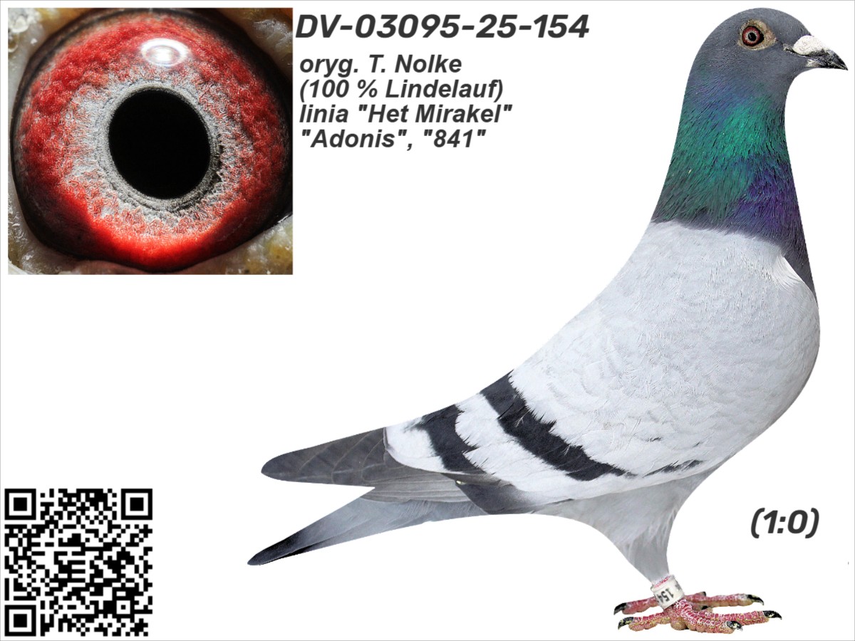 oryg. T. Nolke (100 % Lindelauf), linia "Het Mirakel", "Adonis", "841" Szczegóły pochodzenia w rodowodzie. Gołąb jest sprzedawany bezpośrednio od hodowcy i znajduje się w Polsce, można go obejrzeć w miejscowości Zblewo (woj. pomorskie), po wcześniejszym kontakcie telefonicznym. Więcej informacji o gołębiu i transporcie pod nr tel.: 511 607 710.
