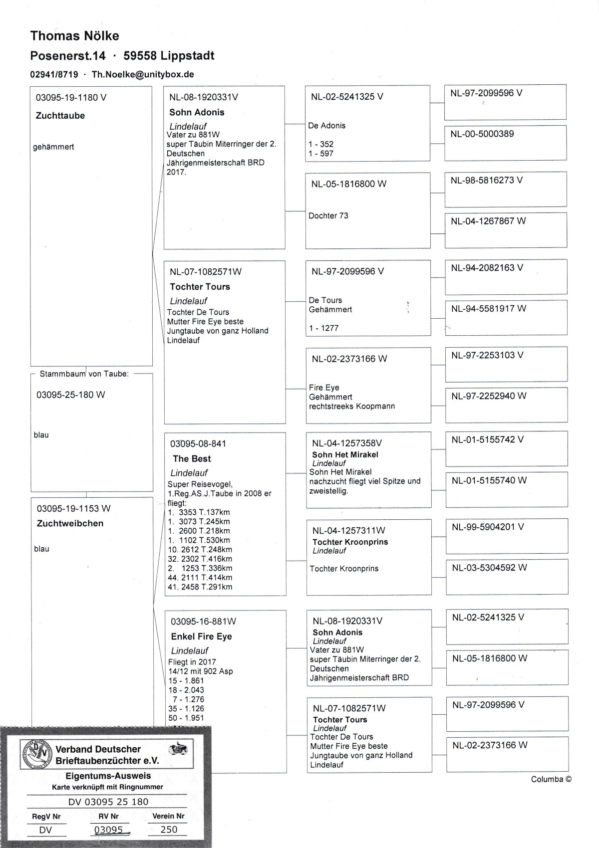 oryg. T. Nolke (100 % Lindelauf), linia "Adonis", "Tours", "The Best" Szczegóły pochodzenia w rodowodzie. Gołąb jest sprzedawany bezpośrednio od hodowcy i znajduje się w Polsce, można go obejrzeć w miejscowości Zblewo (woj. pomorskie), po wcześniejszym kontakcie telefonicznym. Więcej informacji o gołębiu i transporcie pod nr tel.: 511 607 710.