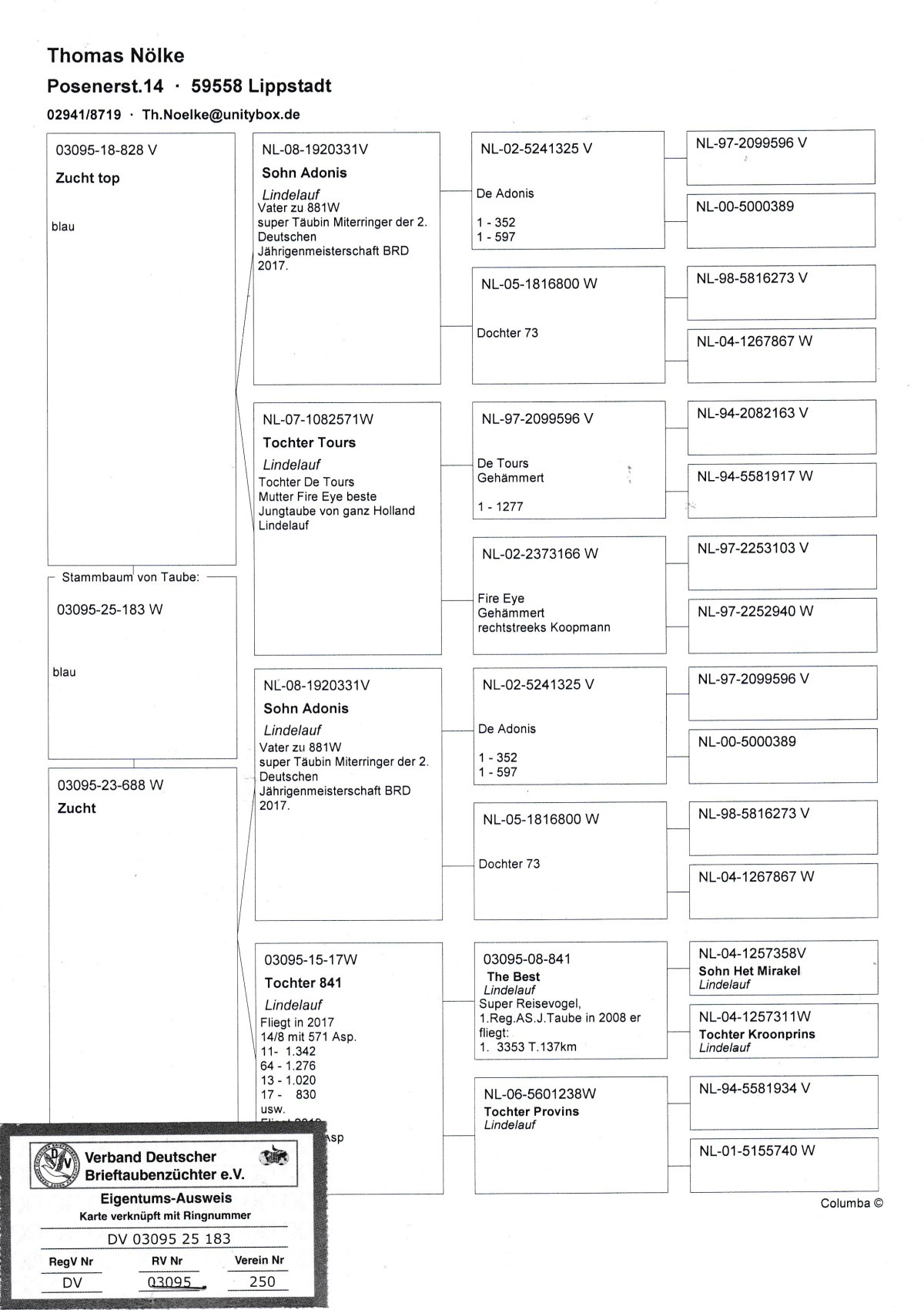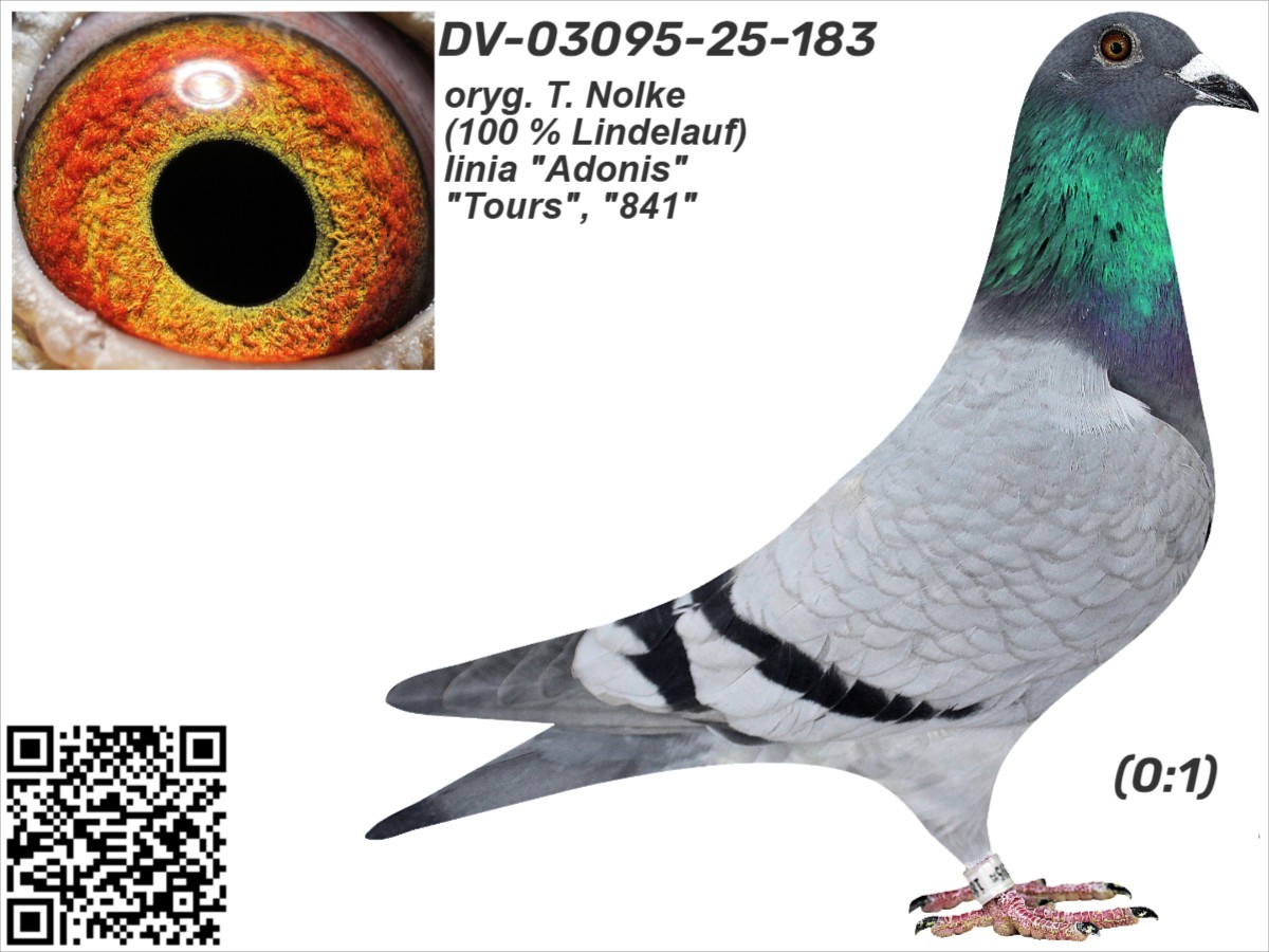 oryg. T. Nolke (100 % Lindelauf), linia "Adonis", "Tours", "841" Szczegóły pochodzenia w rodowodzie. Gołąb jest sprzedawany bezpośrednio od hodowcy i znajduje się w Polsce, można go obejrzeć w miejscowości Zblewo (woj. pomorskie), po wcześniejszym kontakcie telefonicznym. Więcej informacji o gołębiu i transporcie pod nr tel.: 511 607 710.