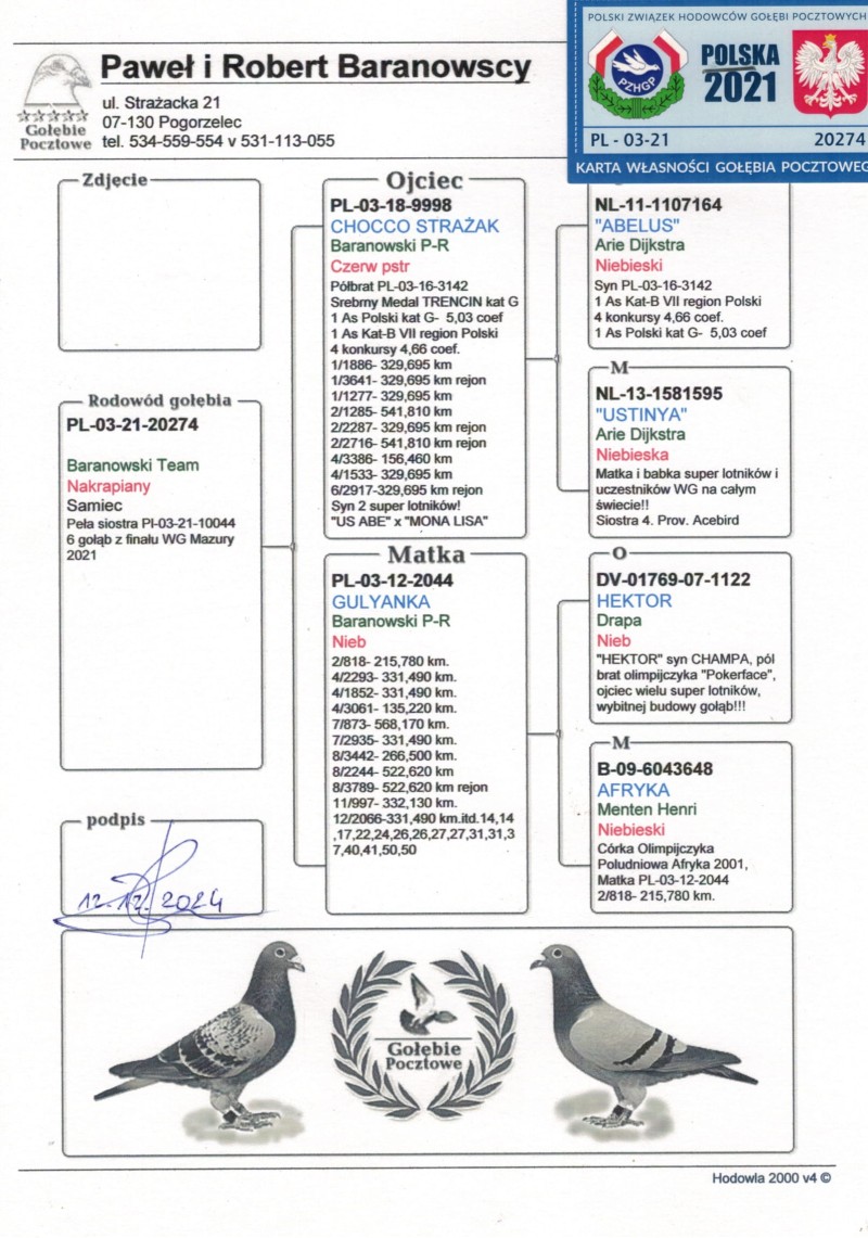 Oryginalny gołąb z hodowli Paweł i Robert Baranowscy. Szczegóły pochodzenia w rodowodzie. Więcej informacji pod nr tel.: 538150106 / 513476931
