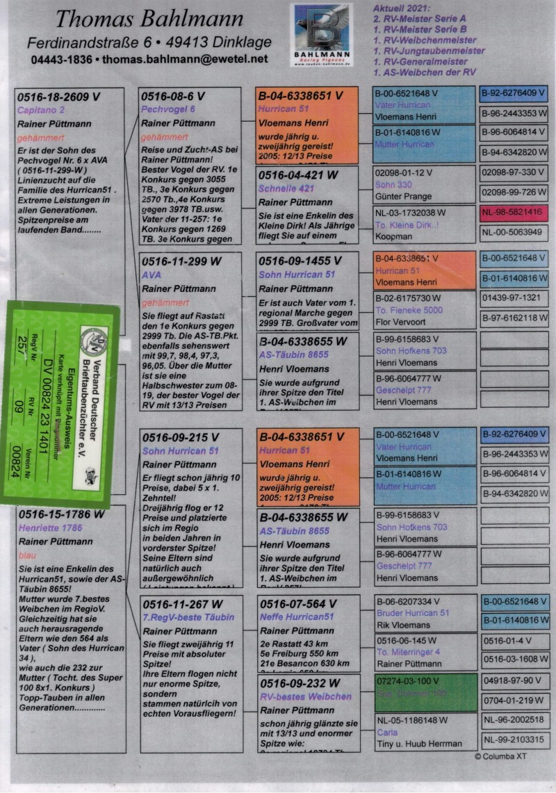Oryginalny gołąb z hodowli Thomas Bahlmann. Szczegóły pochodzenia w rodowodzie. Więcej informacji pod nr tel.: 538150106 / 513476931