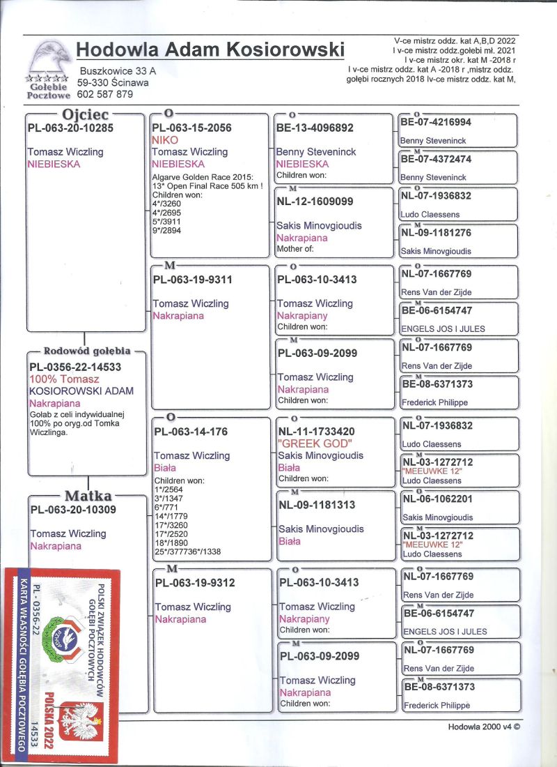Oryginalny gołąb z hodowli Adam Kosiorowski,szczegóły pochodzenia w rodowodzie,więcej informacji pod nr tel,:663-706-288,transport gołębi po wpłacie pieniążków na konto ,gołębie będą dostarczane kurierem 1-5szt 180zł