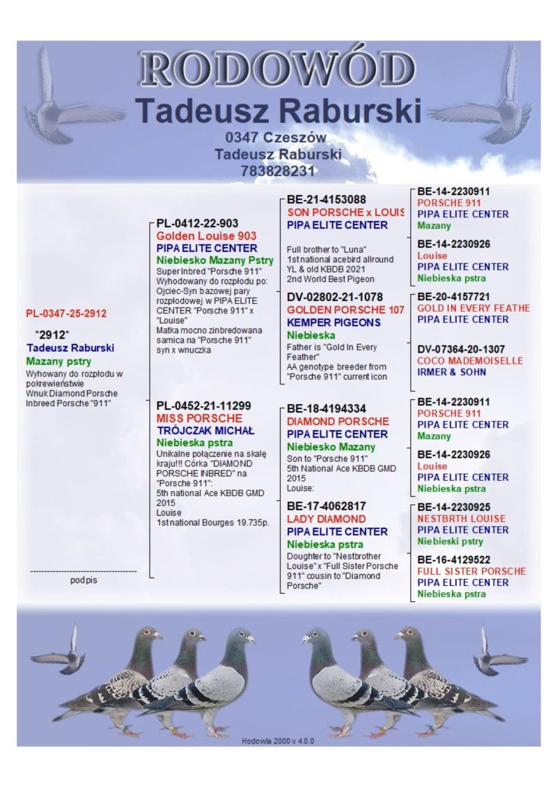 Hodowla skupiona w lotach gołębi na wspólnych gołębnikach z wieloma sukcesami. Zaprasza Państwa do licytacji wartościowego materiału do dalszej hodowli. Proponowany gołąb to inbreed Porsche 911 i wnuk DIAMOND PORSCHE Rodzice z certyfikatem DNA Więcej informacji w rodowodzie oraz pod nr. tel. WYSYŁKA 100ZŁ