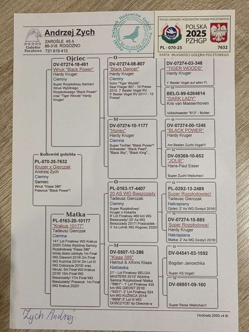 Oryginalny gołąb z hodowli Andrzeja Zycha. Szczegóły pochodzenia zamieszczone w rodowodzie. Więcej informacji pod numerem telefonu: 721 619 412